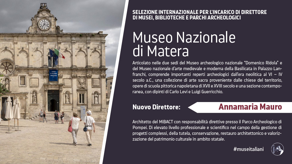 Annamaria Mauro è la nuova direttrice del Museo Nazionale di Matera. Architetto del MiBACT con responsabilità direttive presso il Parco Archeologico di Pompei. Esperta nel campo della gestione di progetti complessi, della tutela, conservazione, restauro architettonico e valorizzazione del patrimonio culturale in ambito statale.