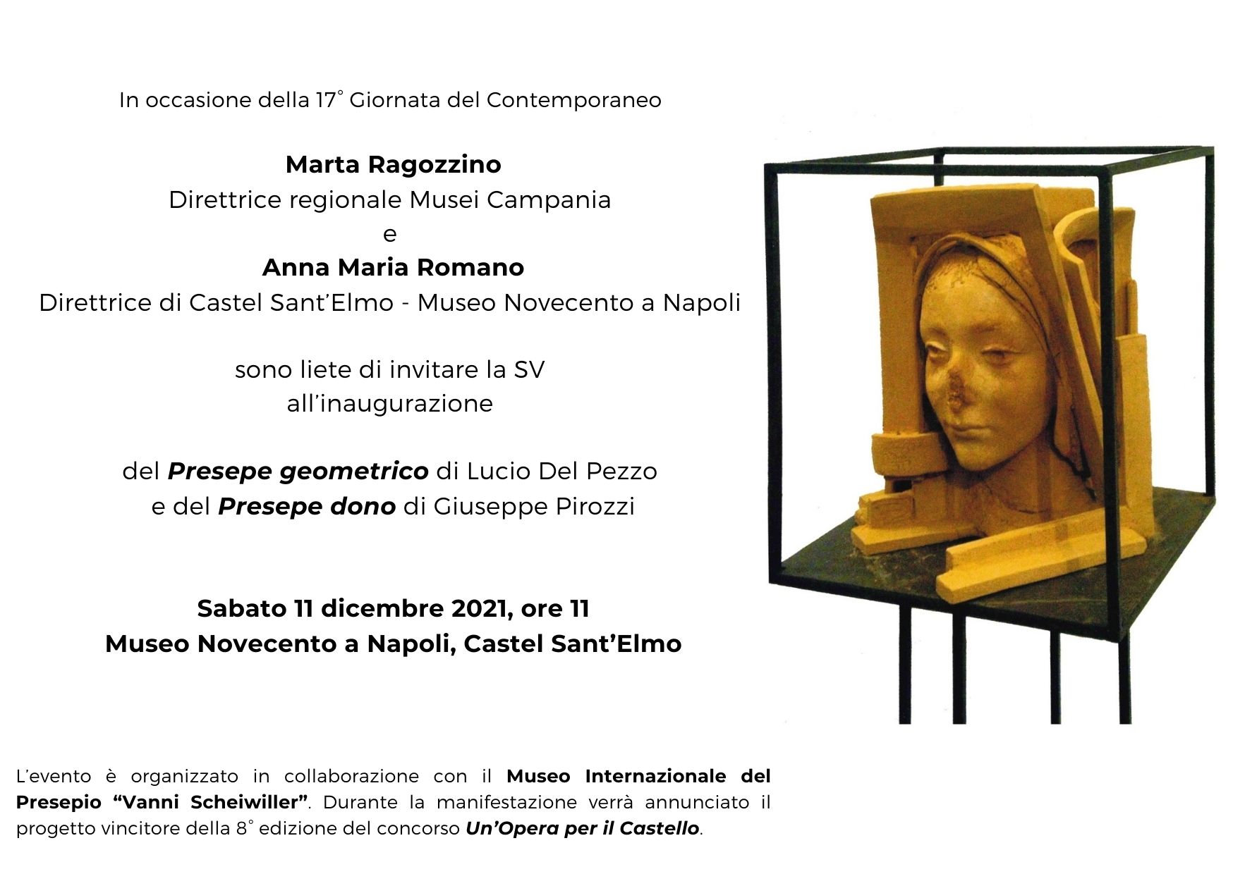 La Direzione regionale Musei Campania è lieta di annunciare che sabato 11 dicembre 2021 alle ore 11.00, in occasione della 17° Giornata del Contemporaneo, promossa ogni anno da AMACI - Associazione Musei d'Arte Contemporanea Italiani, riaprirà al pubblico il Museo Novecento a Napoli sulla piazza d’armi di Castel Sant’Elmo, dove saranno inaugurati due presepi d’artista: Il Presepe geometrico di Lucio Del Pezzo, del 2013, e Il Presepe dono di Giuseppe Pirozzi, del 2012.