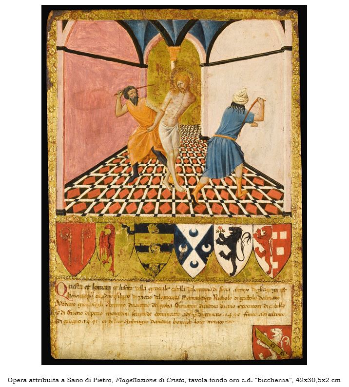 La "Biccherna", una tavola fondo oro, raffigurante la "Flagellazione di Cristo" realizzata nel 1441 e attribuita al pittore rinascimentale senese Sano di Pietro, era stata segnalata nell’asta Sotheby’s di Londra del 7 e 8 dicembre 2016, lotto n. 22, dalla Direzione Generale Archivi. Dopo una lunga controversia con i detentori, grazie agli indirizzi formulati dal Comitato per il recupero e la restituzione dei beni culturali e alla collaborazione dell’Avvocatura generale dello Stato, la Direzione generale Archivi e la Direzione generale Archeologia, Belle Arti e Paesaggio hanno potuto portare a compimento un complesso iter amministrativo per acquisire allo Stato italiano l’opera. Il suo trasferimento è stato possibile grazie al personale della Sezione Antiquariato del Reparto Operativo TPC. La magistratura finanziaria detta Biccherna fu attiva dal XII secolo fino al 1786 nella Repubblica di Siena. I libri dei conti di questa amministrazione pubblica venivano rilegati utilizzando tavolette dipinte con scene religiose, civili e ritratti, che presero il nome stesso della magistratura venendo comunemente definiti Biccherne. Queste magistrature si rinnovavano ogni sei mesi ed era uso dei magistrati commissionare, al termine dell'incarico, la copertina lignea della raccolta degli atti prodotti durante l’esercizio della carica. Queste copertine potevano raffigurare, oltre agli stemmi, una scena, talvolta a tema sacro, o simbolico, o legato a un avvenimento di particolare rilievo accaduto durante il mandato. Le 105 tavolette, oggi esposte presso il Museo delle Biccherne, annesso all’Archivio di Stato di Siena, datano tra il 1258 e il 1682. Si tratta di una serie di eccezionale valore documentario sulla storia e sull'urbanistica cittadina, oltre a vantare un rilevante pregio artistico, dal momento che le coperte dipinte sono opera di pittori senesi, talvolta tra i maggiori. Con l’arrivo della Biccherna attribuita a Sano di Pietro, un nuovo prestigioso bene arricchisce questa straordinaria collezione.