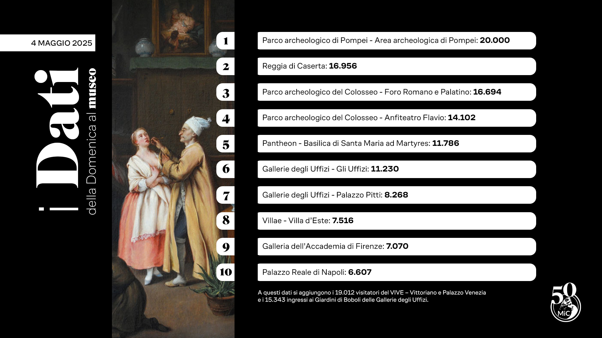 A questi dati si aggiungono i 19.012 visitatori del VIVE – Vittoriano e Palazzo Venezia e i 15.343 ingressi ai Giardini di Boboli delle Gallerie degli Uffizi.