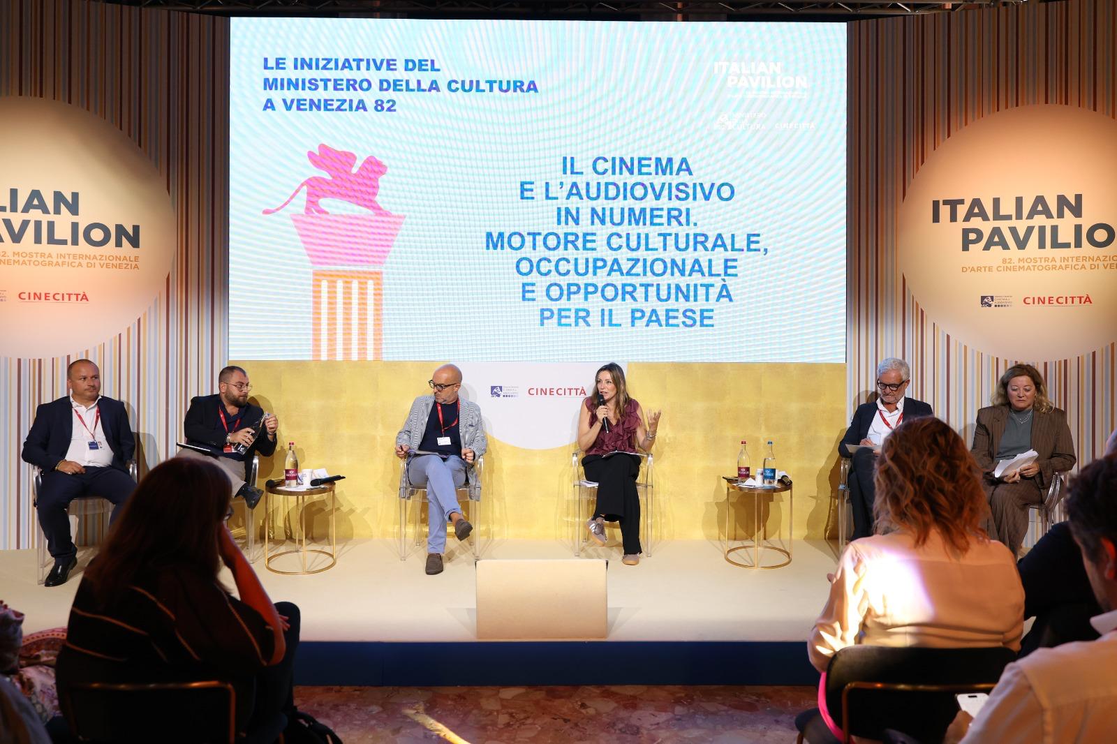 Lo ha affermato il Sottosegretario alla Cultura Lucia Borgonzoni intervenendo in apertura dell’evento dal titolo “Il cinema e l’audiovisivo in numeri. Motore culturale, occupazionale e opportunità per il Paese”, promosso in occasione dell’82ma edizione della Mostra Internazionale d’Arte Cinematografica di Venezia dalla Direzione Generale Cinema e Audiovisivo del Ministero della Cultura all’Italian Pavilion – coordinato da MiC e Cinecittà – all’Hotel Excelsior, a Venezia Lido. Aperta dai saluti istituzionali del Presidente di Cinecittà Antonio Saccone, l’iniziativa si è svolta alla presenza di un’ampia rappresentanza di associazioni del mondo del cinema e dell’audiovisivo.