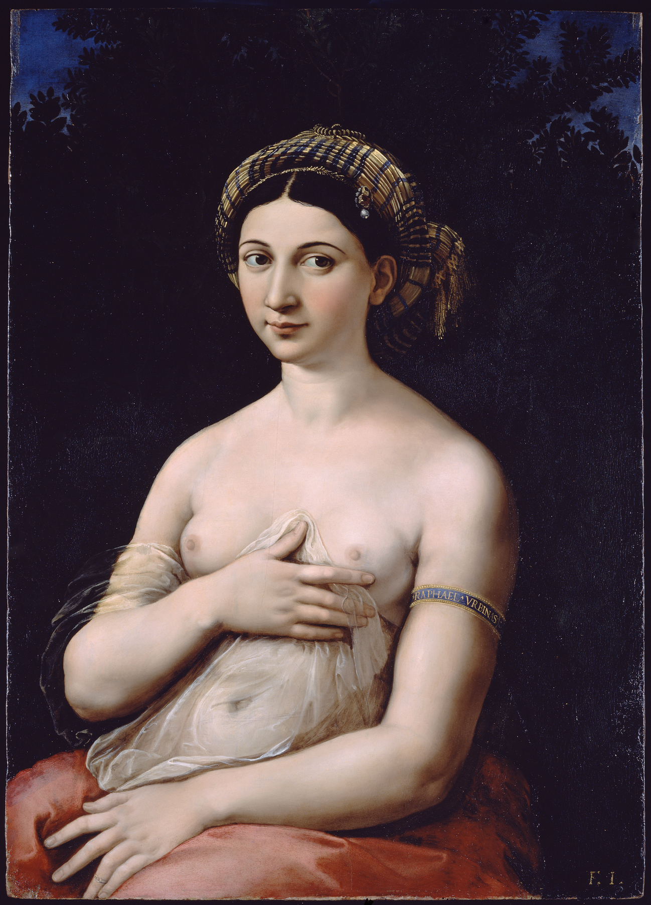 La donna raffigurata è, secondo la tradizione, l’amante e musa ispiratrice di Raffaello: Margherita Luti, figlia di un fornaio di Trastevere, da cui il soprannome “Fornarina”. Non si ha notizia di chi fosse il committente dell’opera e ciò potrebbe avvalorare l’ipotesi che Raffaello l’abbia dipinta per sé, negli ultimi anni della sua vita. Che si tratti o meno dell’amante di Raffaello, dietro questo volto imperfetto, dai tratti marcati, si nasconde una rappresentazione di Venere. La posa delle mani, una adagiata nel grembo, l’altra sul seno, segue il modello della “Venere pudica” della statuaria classica: un gesto di pudore che tuttavia orienta lo sguardo dell’osservatore proprio su ciò che si vorrebbe nascondere. Simboli della dea dell’amore sono anche il bracciale della donna su cui si legge “Raphael Urbinas”, firma dell’autore e pegno di vincolo amoroso, nonché, sullo sfondo, il cespuglio di mirto e il ramo di melo cotogno, simbolo di fertilità. Il quadro apparteneva già ai primi proprietari del palazzo, gli Sforza di Santafiora, e fu uno dei primi ad essere acquistato dai Barberini.
