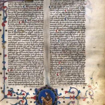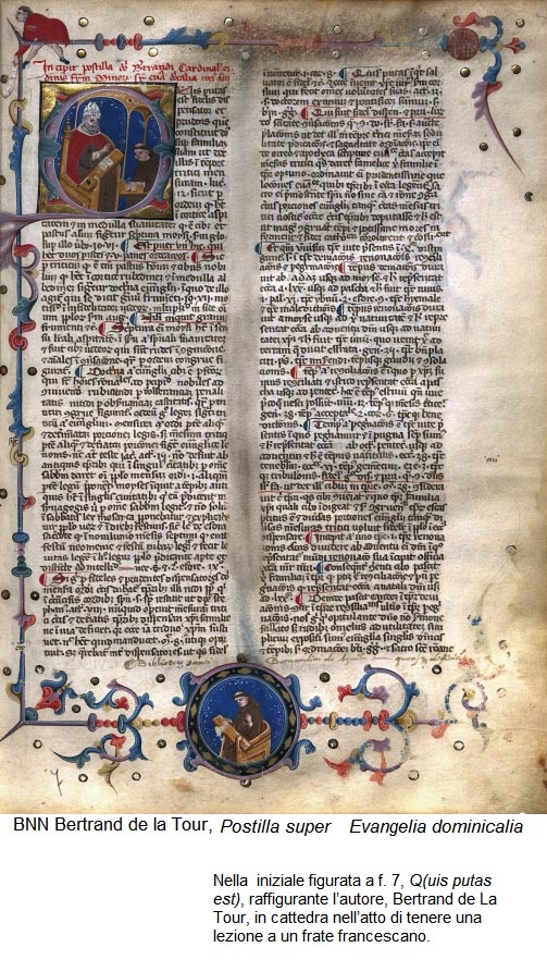 Si tratta di opere di particolare interesse religioso ed artistico, un tempo riposti nelle scansie e negli armadi delle biblioteche dei conventi francescani d’Abruzzo, confluite a Napoli a partire dal 1789 su iniziativa di Francesco Saverio Gualtieri, futuro vescovo dell’Aquila, e di altri funzionari dell’allora Real Biblioteca napoletana, che per vanto dell’istituzione e finalità conservative vollero trasferirli nell’antica capitale del Regno preservandoli da sicura dispersione. Tra queste si segnala una splendida Bibbia con settantotto iniziali figurate, redatta a Parigi tra il 1260-1270 che testimonia la grande diffusione anche fuori dalla Francia delle bibbie parigine , un libro di Salmi ed orazioni della fine del XII secolo destinati ad una ricca committenza con tre iniziali a tralci d’oro di particolare pregio su riquadri azzurri e verdi, un codice di canti liturgici di fine 1300 redatti a Praga con bellissime iniziali figurate, di cui una attribuita Nicolaus Kuthner, uno dei miniatori attivi per il re di Boemia e Germania, Venceslao IV. Ricca di suggestione è, invece, la vicenda di un altro bellissimo manoscritto padovano (1320-1326) di Bertrand de la Tour, Postilla super Evangelia dominicalia, forse usato proprio da San Giovanni da Capestrano , mentre un altro codice disicuro interesse del XIV secolo, contiene, invece, lo Speculum iudiciale di Guillaume Durand, illustrato da tre miniature tabellari.