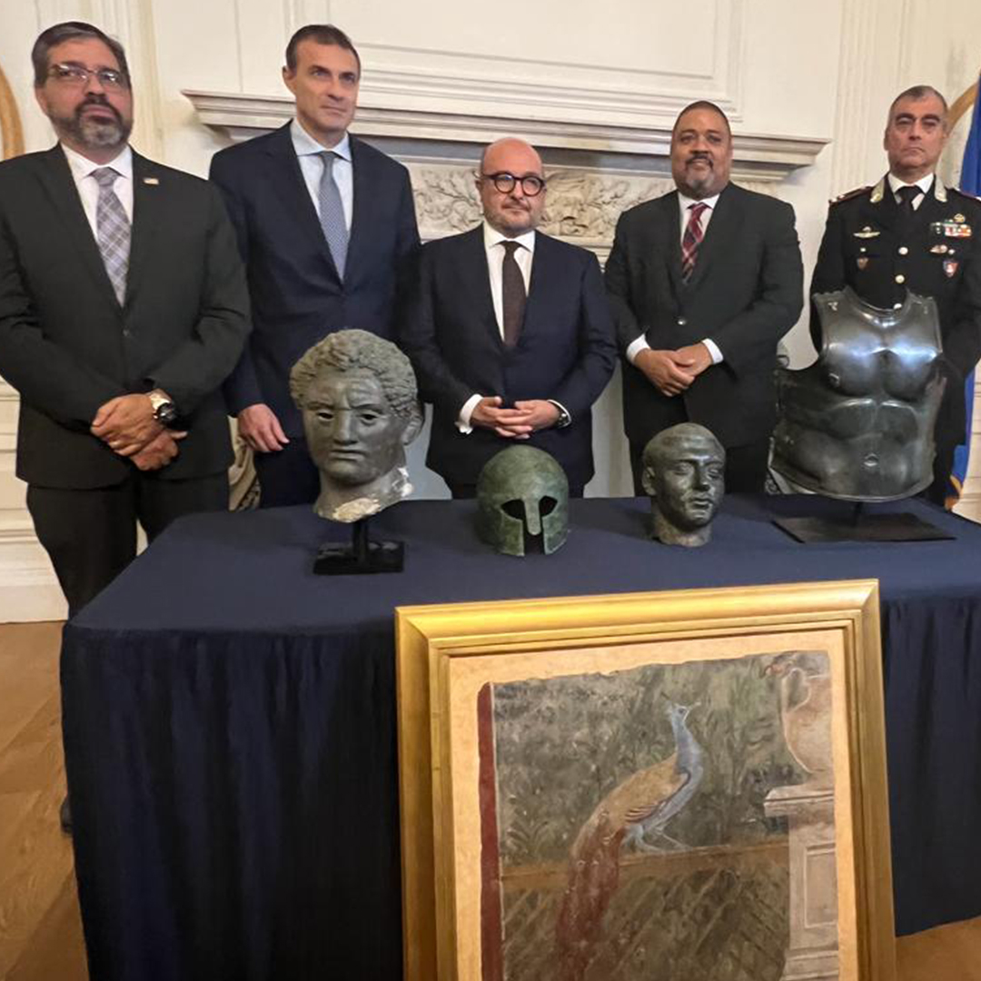 Stati Uniti restituiscono all'Italia 19 opere d’arte trafugate illegalmenteIl Ministro della Cultura, Gennaro Sangiuliano, è intervenuto nella sede del Consolato Generale d’Italia di New York, insieme al Procuratore distrettuale di Manhattan, Alvin Bragg, a una cerimonia di restituzione di 19 opere d’arte classica, trafugate illegalmente dall’Italia e adesso restituite al patrimonio dello Stato, grazie alla collaborazione tra il Comando Carabinieri per la Tutela del Patrimonio Culturale, l’Homeland Security Investigations e la Procura Distrettuale di Manhattan. [continua]