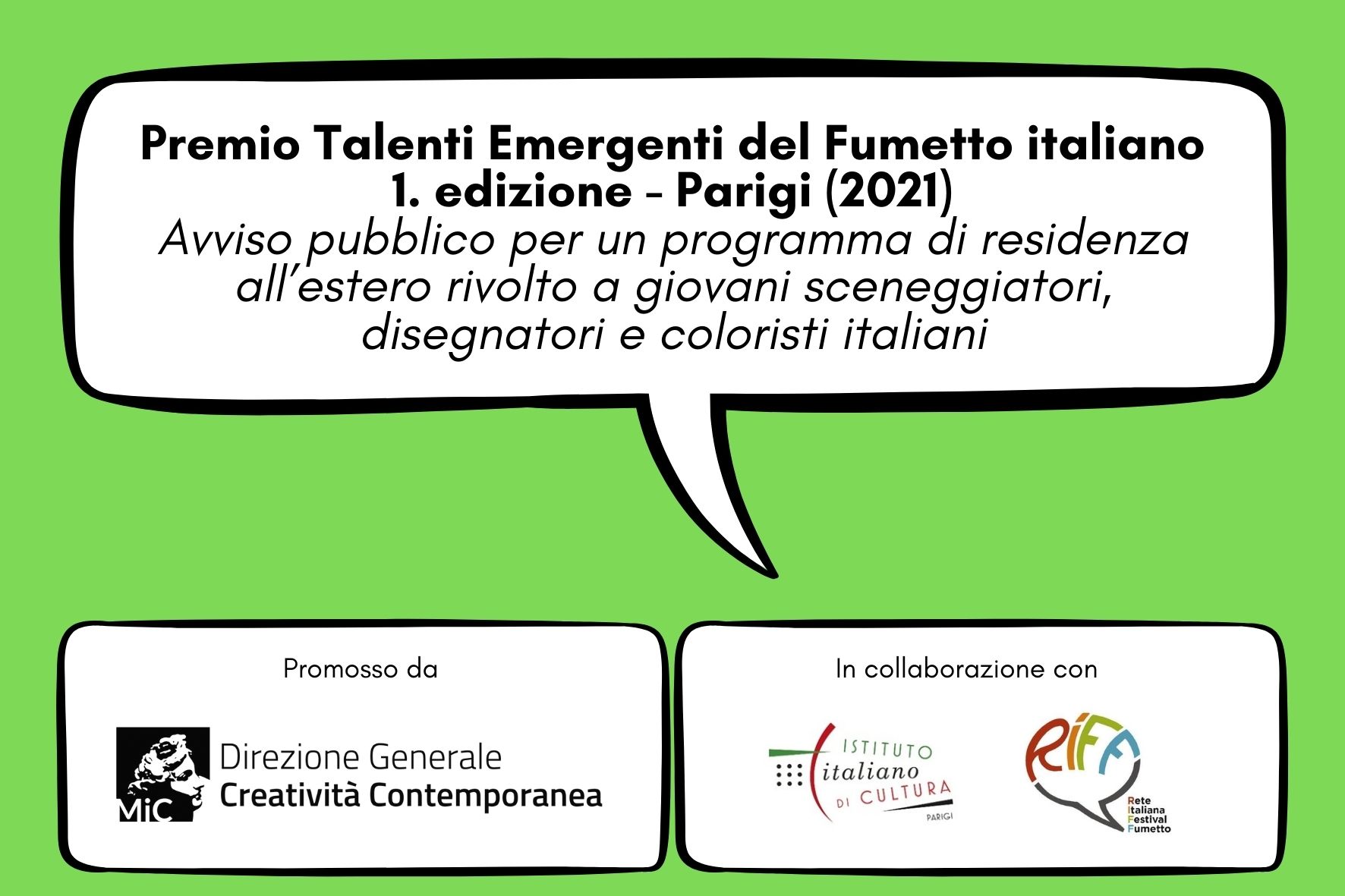 La Direzione Generale Creatività Contemporanea del Ministero della Cultura, in collaborazione con l’Istituto Italiano di Cultura di Parigi e la Rete Italiana Festival di Fumetto, lancia la prima edizione del “Premio Talenti Emergenti del Fumetto italiano”, avviso pubblico per un programma di residenza all’estero rivolto a giovani sceneggiatori, disegnatori e coloristi italiani.