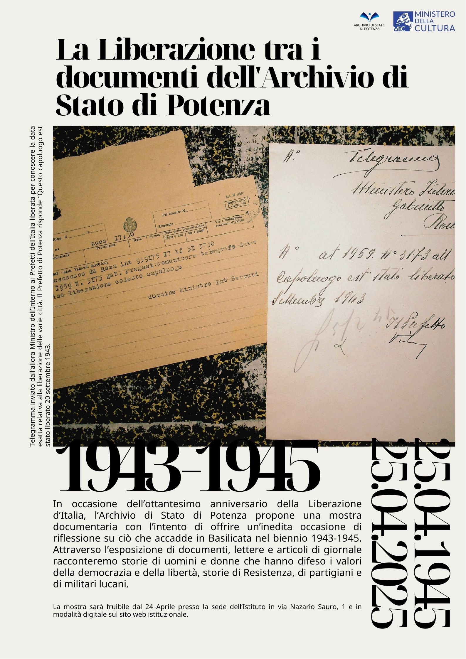 Per celebrare la ricorrenza l’Archivio di Stato di Potenza proporrà una mostra documentaria che racconterà la situazione politica, sociale ed economica della Basilicata nel periodo 1943-1945.