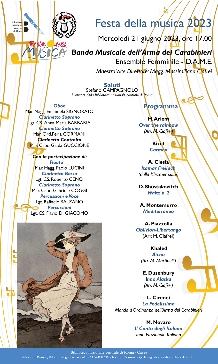 In occasione della 29a Festa della Musica, la Banda Musicale dell'Arma dei Carabinieri e la Biblioteca nazionale centrale di Roma sono liete di presentare il concerto dell'Ensemble Femminile - D.A.M.E.