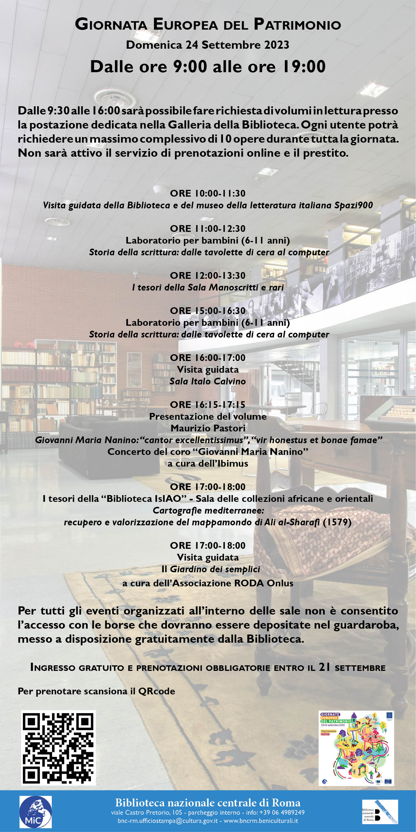 Domenica 24 settembre, in occasione delle Giornate Europee del Patrimonio 2023, la Biblioteca nazionale centrale di Roma sarà aperta al pubblico dalle 9:00 alle 19:00.