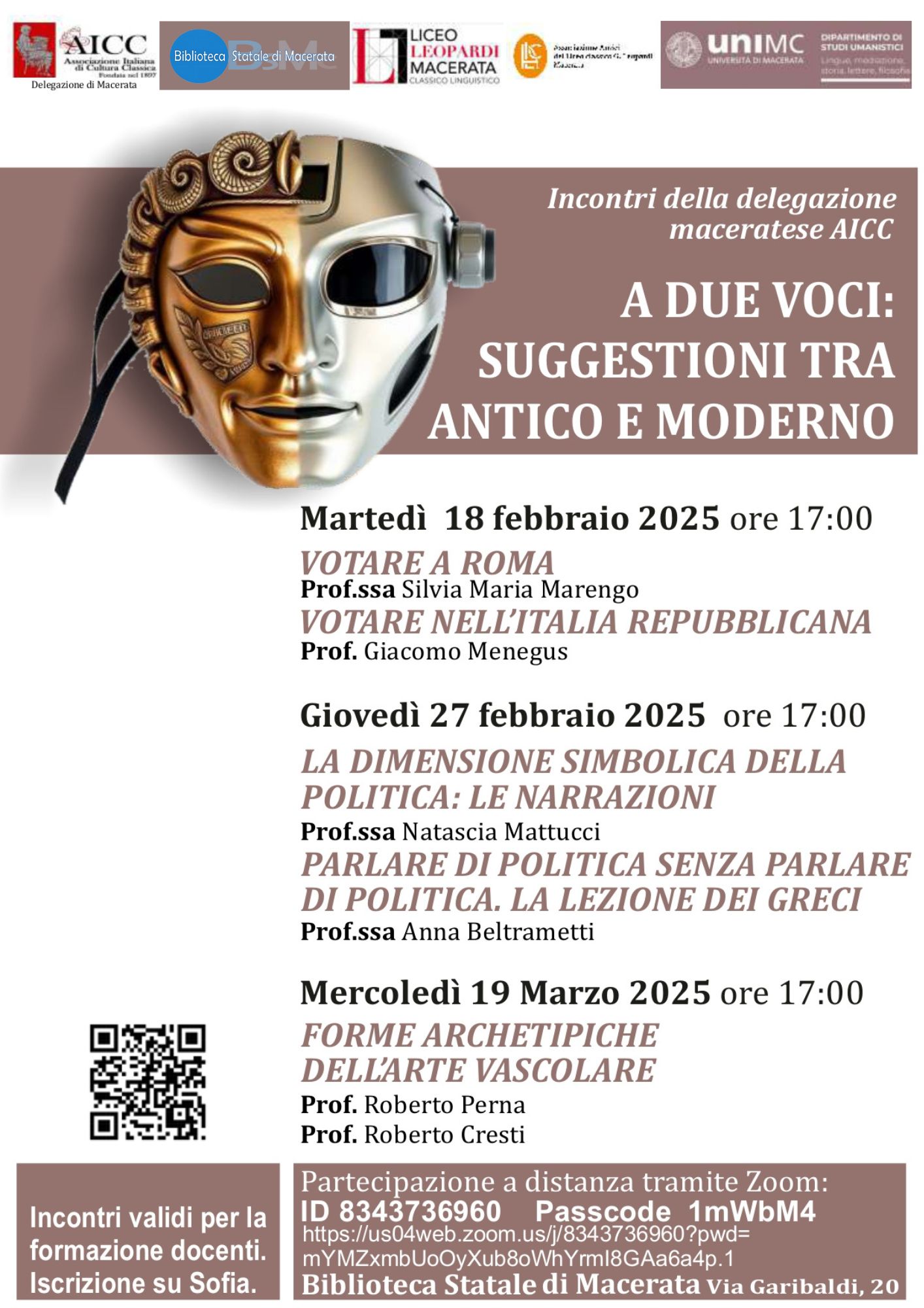 La Biblioteca Statale di Macerata ospita martedì 18 febbraio 2025 alle ore 17:00 il primo incontro della delegazione maceratese AICC “A DUE VOCI: SUGGESTIONI TRA ANTICO E MODERNO” organizzato dal Dipartimento di Studi Umanistici dell’Università degli Studi di Macerata in collaborazione con l’Associazione Italiana di Cultura Classica, il Liceo Classico Linguistico “G. Leopardi” e l’Associazione “Amici del Liceo Classico G. Leopardi” di Macerata.