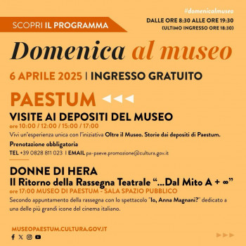 A Paestum, alle ore 10:00, 12:00, 15:00 e 17:00, si potranno scoprire i depositi del Museo e i suoi tesori nascosti che risvegliano antiche leggende e che permettono di vivere un’esperienza unica con l’iniziativa “Oltre il Museo. Storie dai depositi di Paestum”. Prenotazione obbligatoria al numero +390828811023 o alla mail pa-paeve.promozione@cultura.gov.it