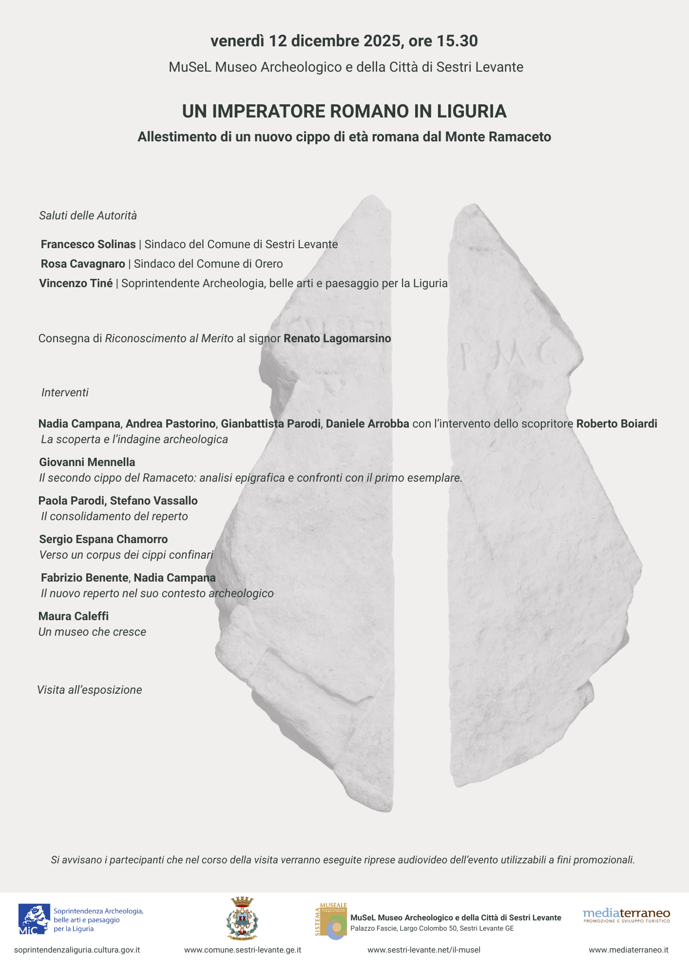 Si invitano gli interessati all’Evento organizzato da Soprintendenza Archeologia, belle arti e paesaggio per la Liguria con il Comune di Sestri Levante, che avrà luogo venerdì 12 dicembre presso il MUSEL Museo Archeologico e della Città di Sestri Levante (GE) in occasione dell’allestimento del cippo iscritto, segnale di confine di età imperiale, recuperato nel 2024 nell’alta Val Fontanabuona, in provincia di Genova. Assieme ad un primo cippo, rinvenuto nel 2015 nella medesima zona, esso costituisce una rilevante testimonianza superstite in Italia.