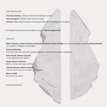 Saranno presenti lo scopritore Roberto Boiardi e Renato Lagomarsino, cui sarà assegnato un riconoscimento al merito per il prezioso contributo alla conoscenza dell’archeologia del Tigullio.