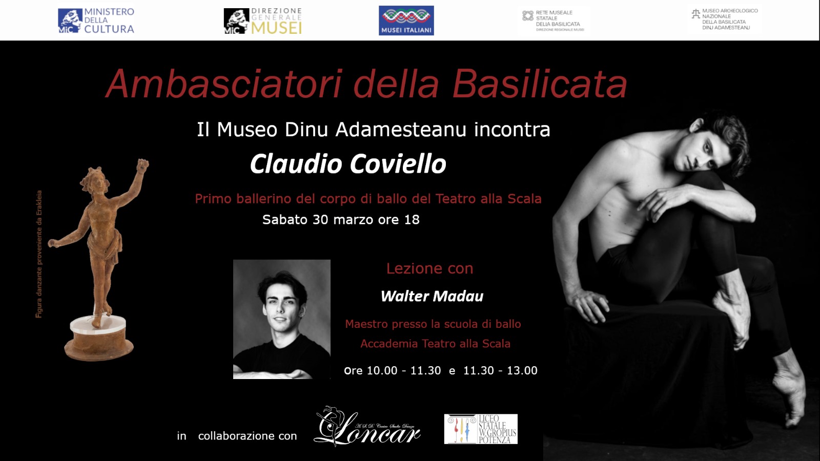 Sabato 30 marzo, presso il Museo Archeologico Nazionale "Dinu Adamesteanu" di Potenza, Claudio Coviello, potentino di nascita e primo ballerino del Teatro alla Scala e Walter Madau, Maestro presso la scuola di ballo dell'Accademia Teatro alla Scala, terranno uno stage di danza alle ore 10.00 e alle 11.30.