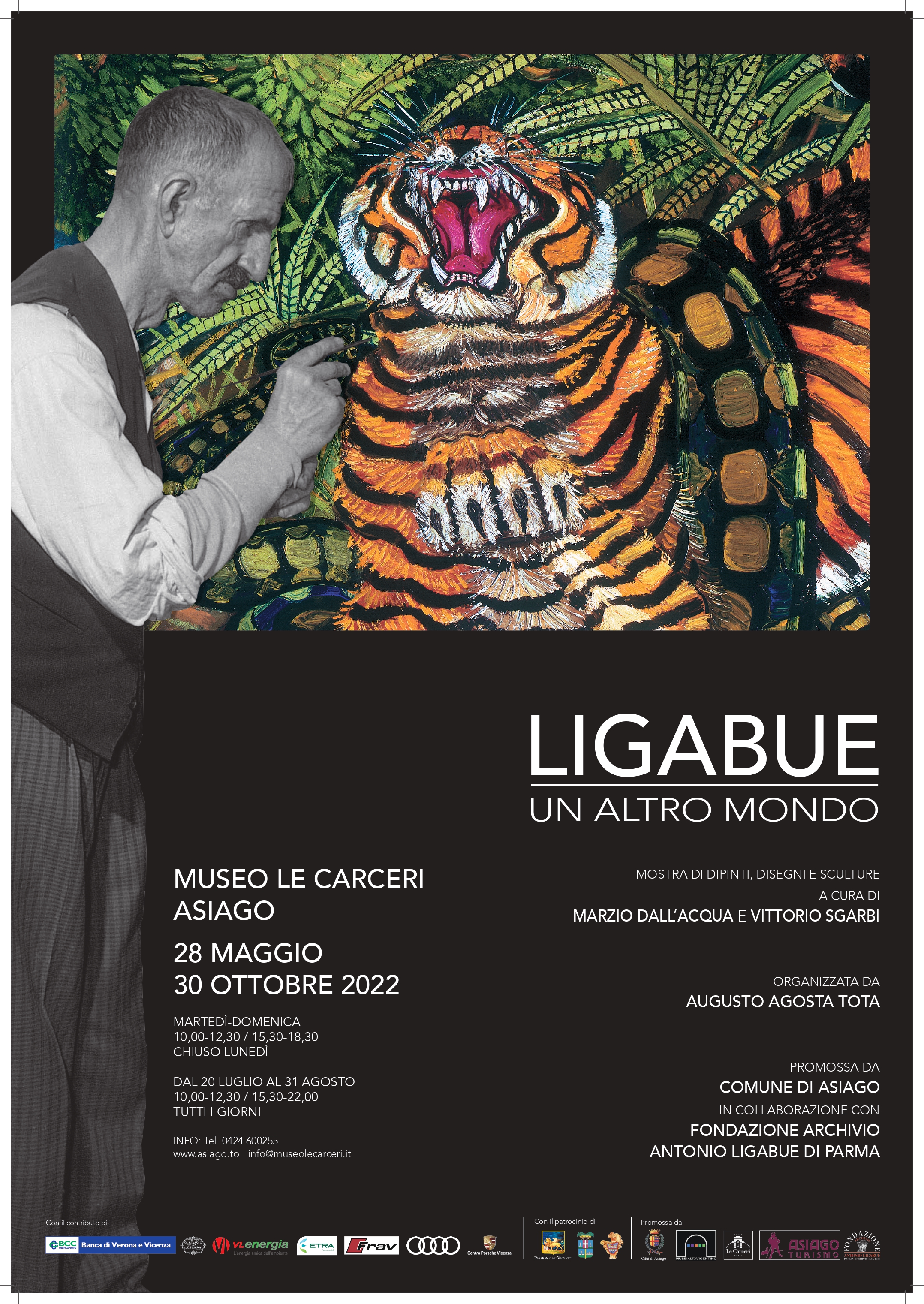 Mostra di dipinti, disegni e sculture a cura di Marzio Dall’Acqua e Vittorio Sgarbi organizzata da Augusto Agosta Tota promossa da Comune di Asiago in collaborazione con Fondazione Archivio Antonio Ligabue di Parma.