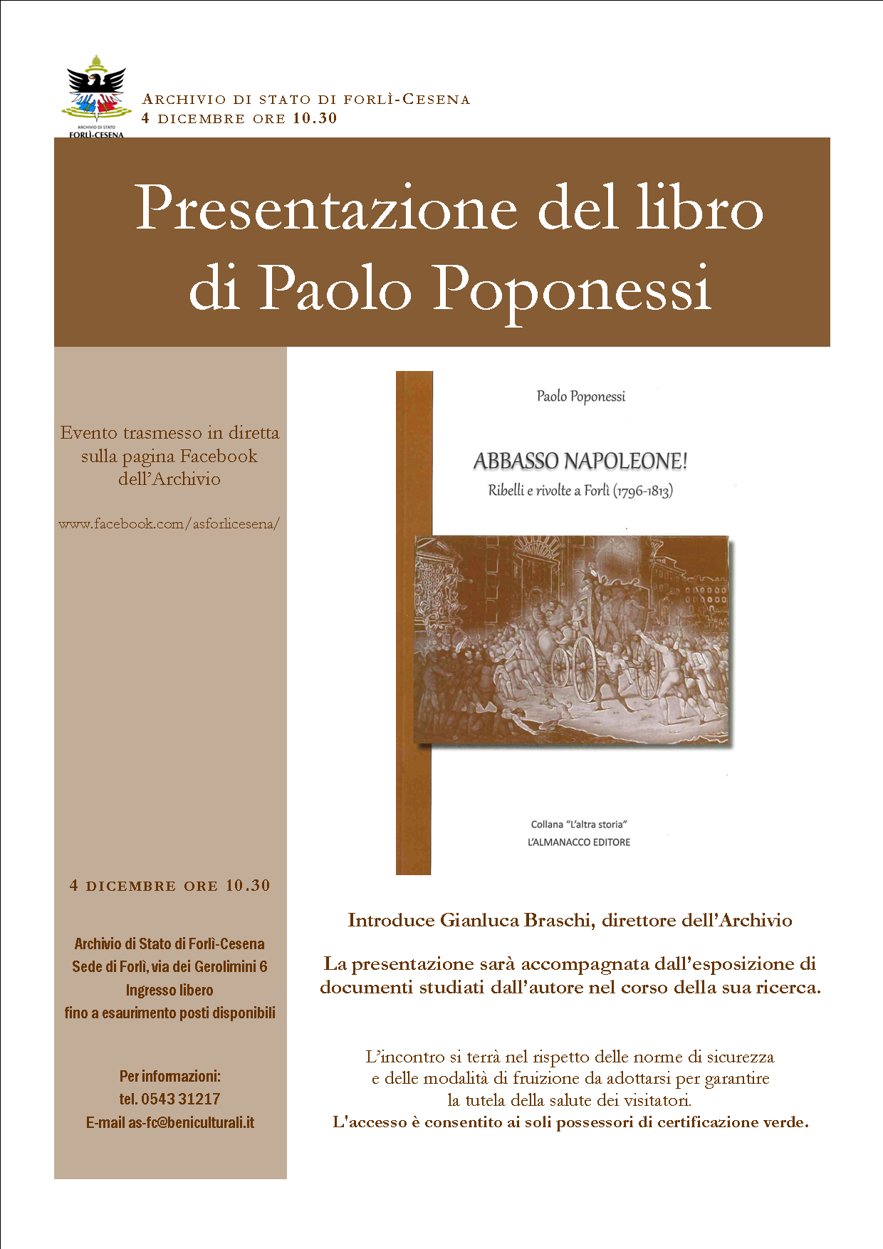 Nell'ambito del piano di valorizzazione promosso dal Ministero della Cultura, l'Archivio di Stato di Forlì-Cesena propone per la mattina di sabato 4 dicembre 2021 due iniziative presso la sede di Forlì: un'apertura straordinaria della sala di studio con orario 9-13, per consentire a coloro che non possono accedere durante le consuete aperture settimanali di svolgere ricerche, e alle ore 10.30 la presentazione del libro Abbasso Napoleone! Ribelli e rivolte a Forlì (1796-1813) dello storico forlivese Paolo Poponessi.