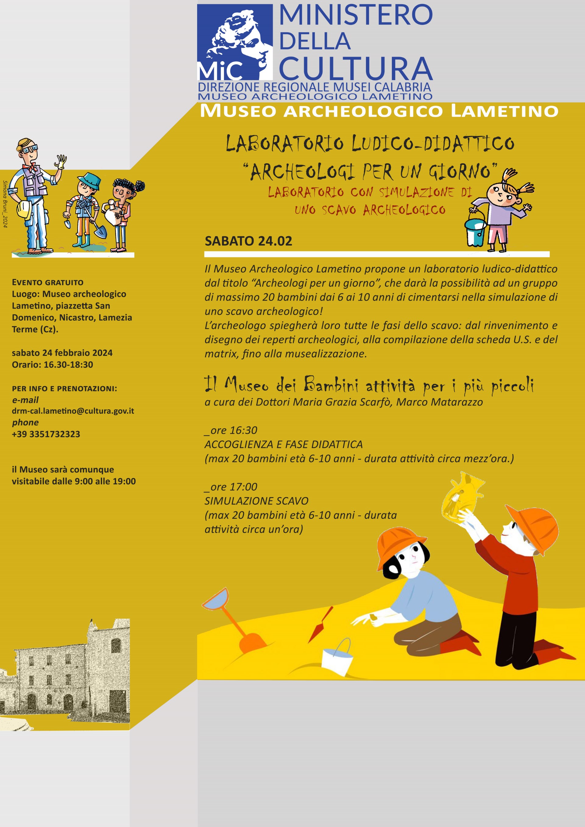 Laboratorio ludico-didattico che darà la possibilità ad un gruppo di massimo 20 bambini dai 6 ai 10 anni di cimentarsi nella simulazione di uno scavo archeologico.