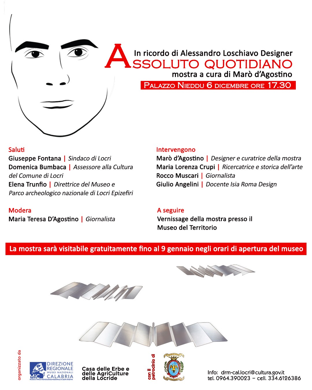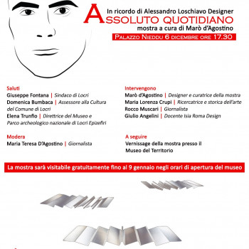 Dal 6 dicembre 2025 al 9 gennaio 2026, il Museo di Palazzo Nieddu del Rio, parte importante del circuito dei luoghi afferenti al Museo e Parco archeologico nazionale di Locri Epizefiri - Direzione regionale Musei nazionali Calabria, ospita la mostra ASSOLUTO QUOTIDIANO, dedicata al celebre designer romano di origini locresi Alessandro Loschiavo. L’esposizione, a cura di Marò d’Agostino, si propone di celebrare l'opera di Loschiavo, attraverso un dialogo di grande stimolo tra le sue creazioni e i reperti archeologici di Locri. in un continuo rimando tra ieri e oggi, antico e contemporaneo.