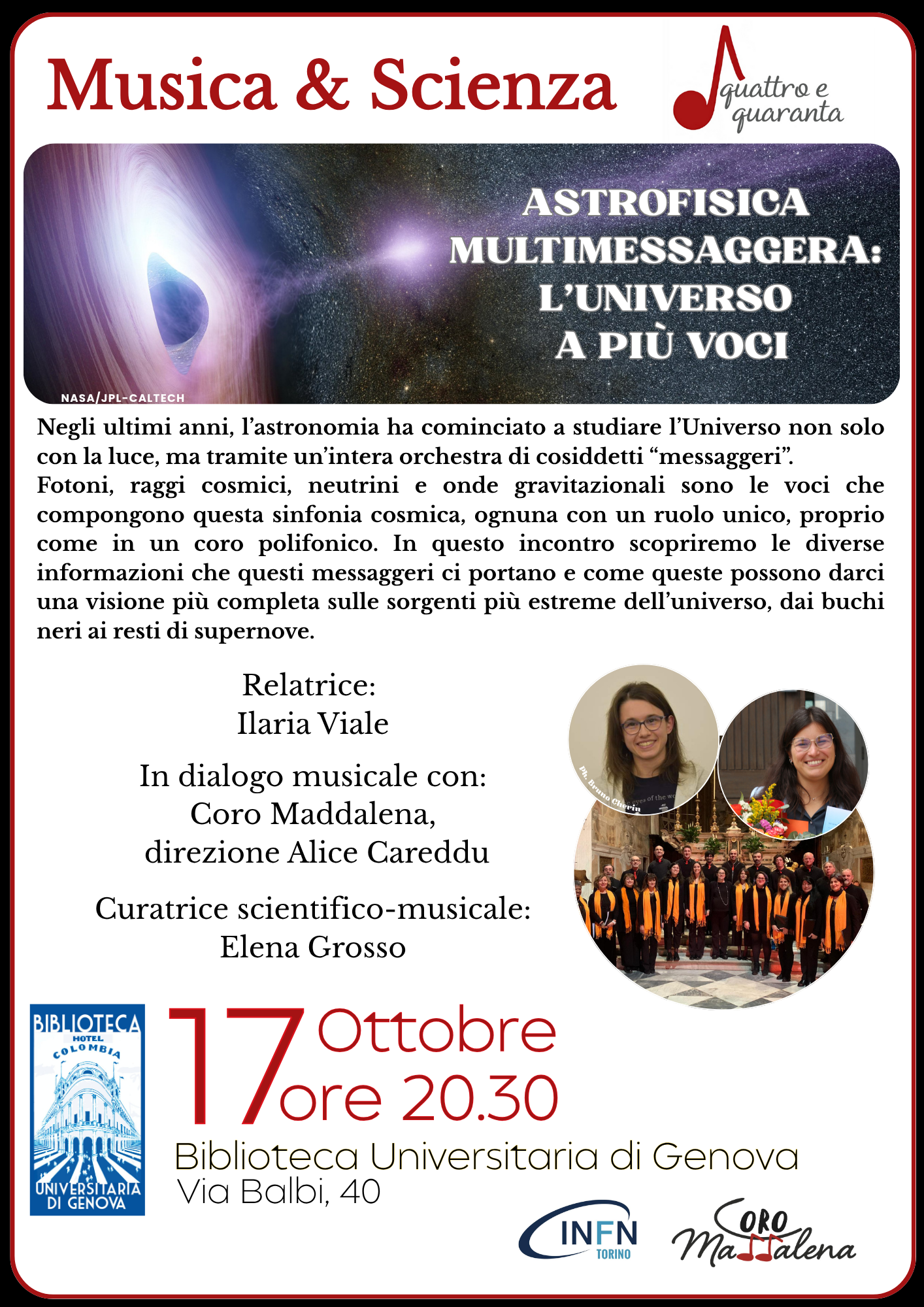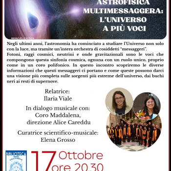 Negli ultimi anni, l’astronomia ha cominciato a studiare l’Universo non solo con la luce, ma tramite un’intera orchestra di cosiddetti “messaggeri”. Fotoni, raggi cosmici, neutrini e onde gravitazionali sono le voci che compongono questa sinfonia cosmica, ognuna con un ruolo unico, proprio come in un coro polifonico. In questo incontro scopriremo le diverse informazioni che questi messaggeri ci portano e come queste possono darci una visione più completa sulle sorgenti più estreme dell’universo, dai buchi neri ai resti di supernove.