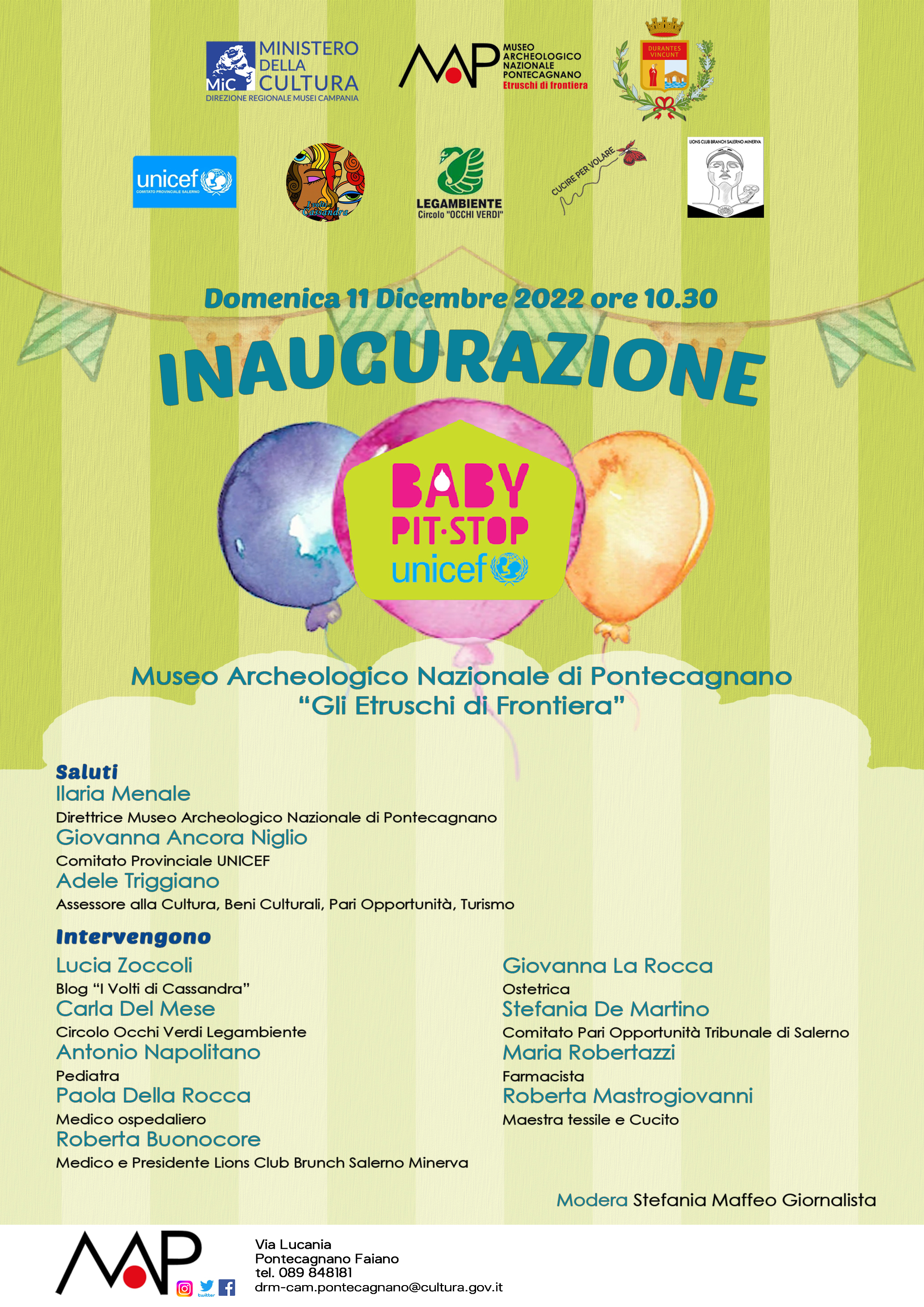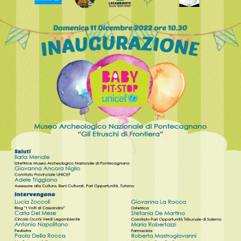 Domenica 11 dicembre 2022 alle ore 10.30 al Museo Archeologico Nazionale di Pontecagnano sarà inaugurato il Baby Pit Stop UNICEF, in collaborazione con il Comitato Provinciale UNICEF di Salerno. L’iniziativa è promossa dalle Associazioni di promozione sociale e culturale del territorio: Blog I Volti di Cassandra, Circolo OcchiVerdi - Legambiente Pontecagnano, Lions Club Brunch Salerno Minerva, Cucire per volare.