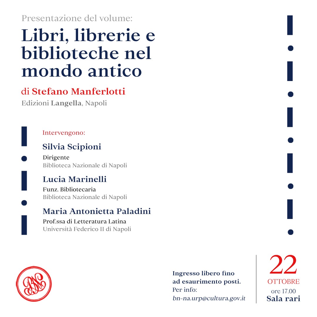 La Biblioteca Nazionale di Napoli è lieta di invitarvi a un incontro con Stefano Manferlotti, professore emerito di Letteratura inglese, che ci accompagnerà in un viaggio affascinante nel mondo del libro antico. Attraverso le parole di autori come Aristofane, Plutarco, Catullo e Marziale, scopriremo le librerie e le biblioteche dell'antica Grecia e Roma, pubbliche e private. Conosceremo collezionisti appassionati, pronti a tutto pur di possedere gli esemplari più rari e preziosi.