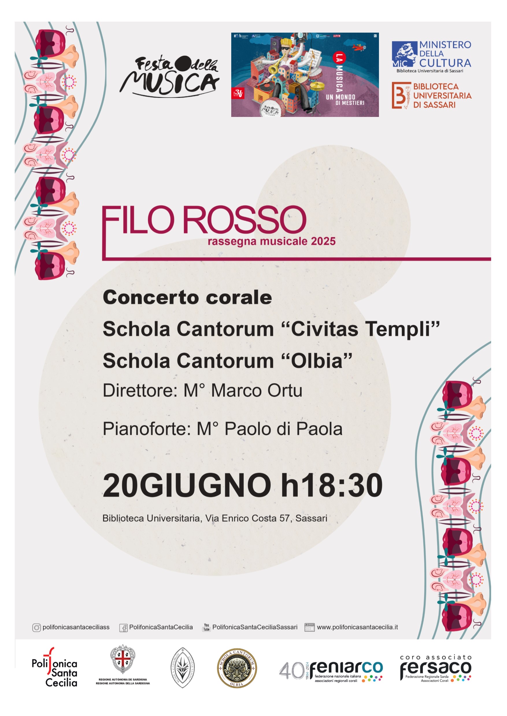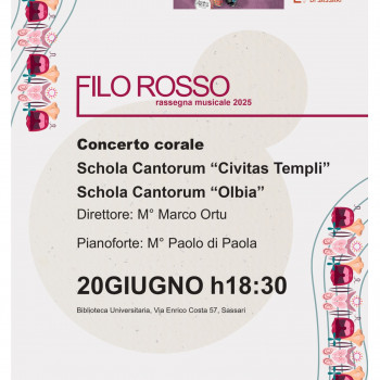 In tema con l'edizione di quest'anno "I mestieri della musica", la Biblioteca Universitaria di Sassari, apre le porte della sede del suo complesso monumentale, all’esibizione delle corali polifoniche Schola Cantorum “Civitas Templi” e Schola Cantorum “Olbia”, dirette dal M° Marco Ortu e accompagnate al pianoforte dal M° Paolo di Paola. L’evento è organizzato assieme alla Polifonica Santa Cecilia di Sassari, all’interno della rassegna musicale 2025 “Il Filo Rosso”.