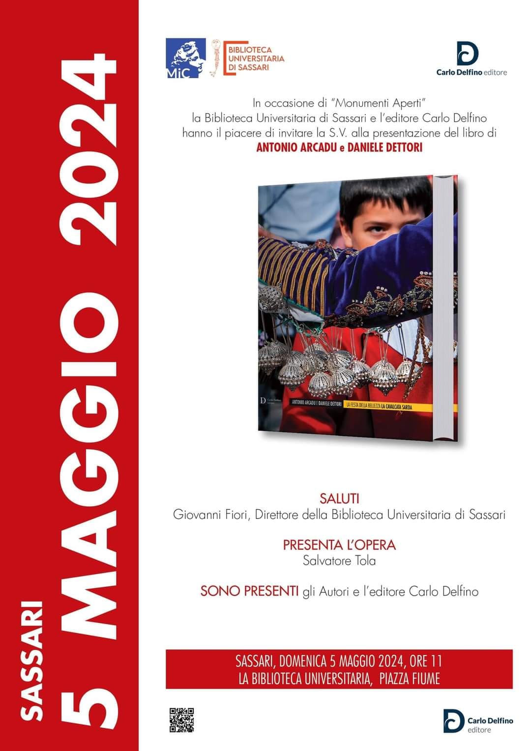 - Domenica 5 maggio, alle ore 11.00, presenteremo il libro di Antonio Arcadu e Daniele Dettori "La festa della Bellezza. La Cavalcata Sarda", edito da Carlo Delfino Editore. Saranno presenti gli autori e l'editore, modererà l'incontro Salvatore Tola.