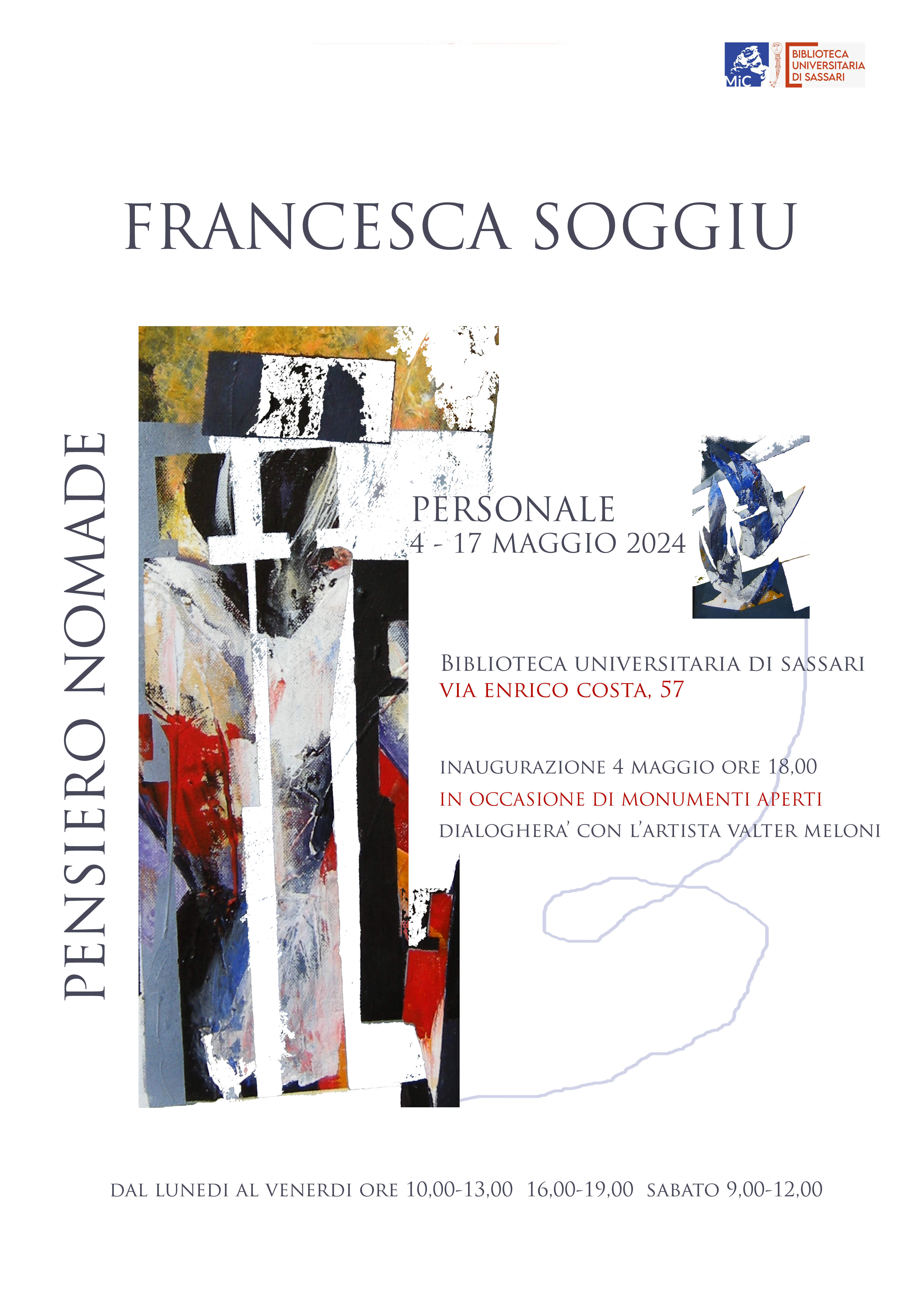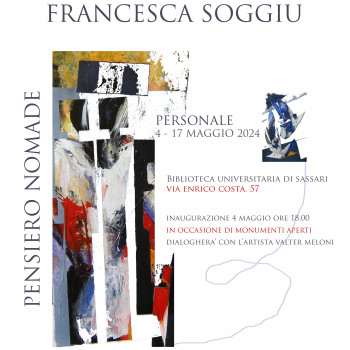 - Sabato 4 maggio, alle ore 18.00, verrà inaugurata la mostra della pittrice Francesca Soggiu, dal titolo "Pensiero Nomade". Sarà presente l'artista che dialogherà con Valter Meloni.