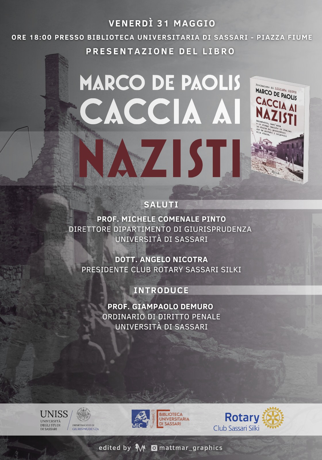 Presentazione del libro “Caccia ai nazisti” dell’autore Marco De Paolis, procuratore generale militare presso la Corte militare di Appello di Roma. Saggio autobiografico edito da Rizzoli, con la prefazione della Senatrice Liliana Segre, nel quale l'autore ripercorre e descrive tutti i procedimenti di guerra che ha dovuto affrontare nella sua esperienza professionale.