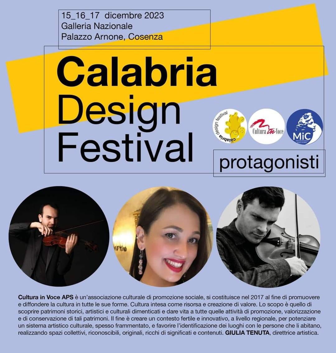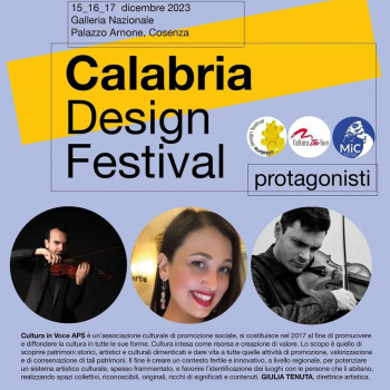 Dal 15 al 17 dicembre 2023 la Galleria nazionale di Cosenza ospita Calabria Design Festival per nuovi dialoghi, nuove idee, nuovi sguardi sulla Calabria e su un altro Sud possibile e necessario! Tre giornate dedicate all'esplorazione del rapporto tra arte, cultura, architettura, ecologia, design. Durante l'evento sono previste esibizioni musicali a cura della Associazione Cultura in Voce