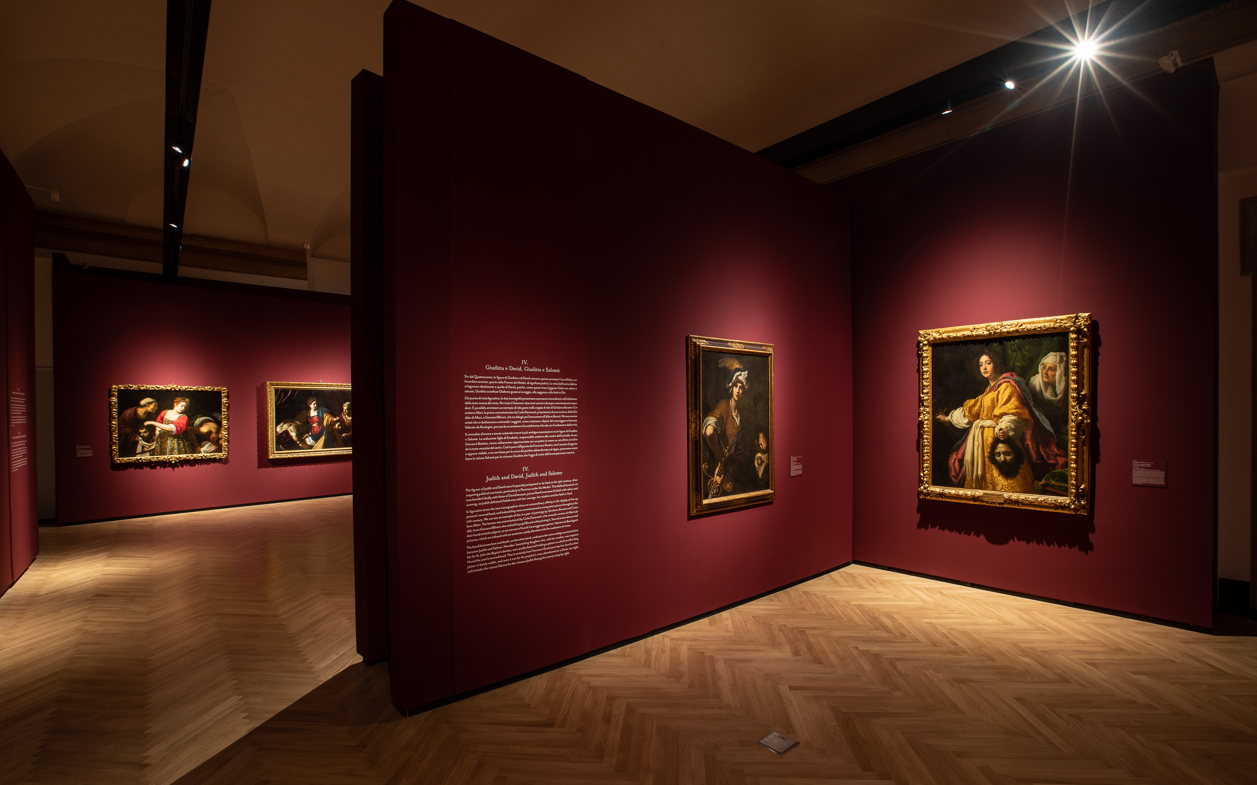 La quarta e ultima sezione, Le virtù di Giuditta. Giuditta e Davide, Giuditta e Salomé è dedicata al confronto tra il tema di Giuditta e Oloferne e quello di Davide e Golia, accomunati dalla lettura allegorica della vittoria della virtù, dell’astuzia e della giovinezza sulla forza bruta del tiranno che finisce decapitato. La decapitazione è alla base anche del testo evangelico del martirio di Giovanni Battista, e il tema di Salomé viene spesso confuso nella raffigurazione pittorica con quello di Giuditta.