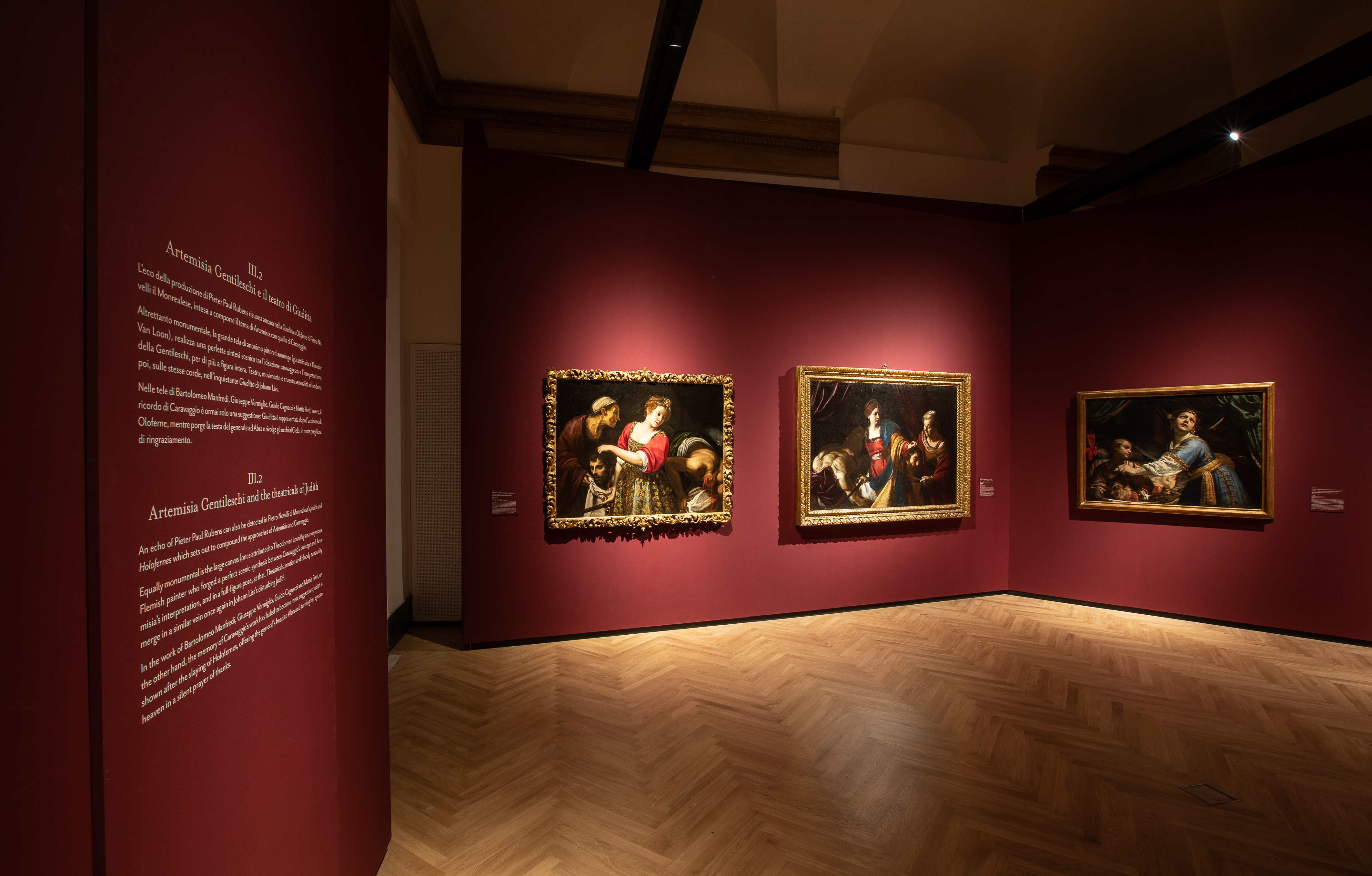 Ci volle però una donna per calarsi completamente nei panni dell’eroina biblica. La massima interprete del soggetto è stata, senza dubbio, Artemisia Gentileschi, cui è intitolata la terza sezione Artemisia Gentileschi e il teatro di Giuditta. Artemisia, insieme al padre Orazio, si cimentò più volte con il tema, comprendendone le potenzialità in relazione alla rappresentazione della figura femminile come donna forte, ed exemplum virtutis, ed il tema, grazie al suo lavoro, diventerà un genere richiestissimo nelle corti europee.