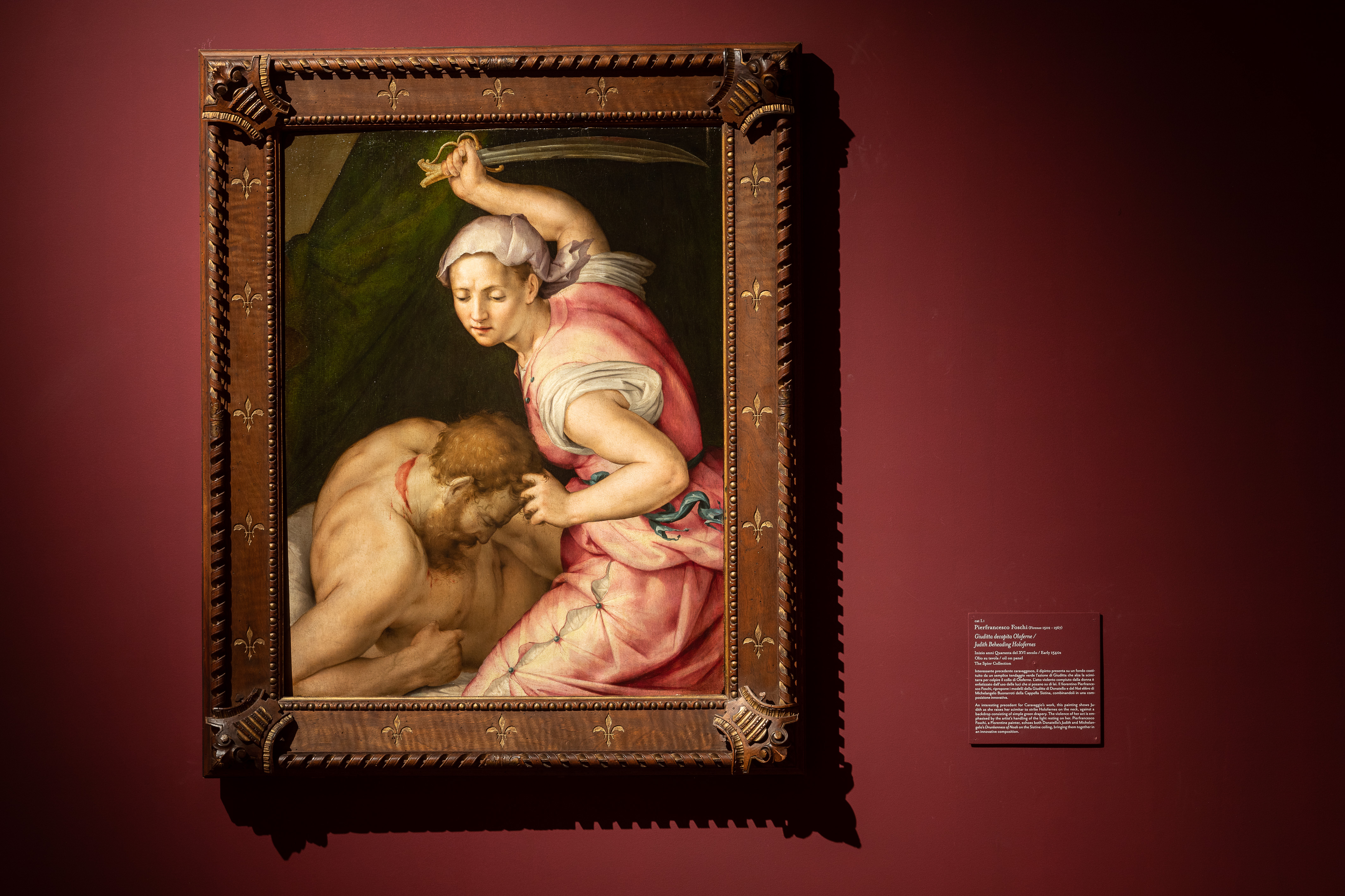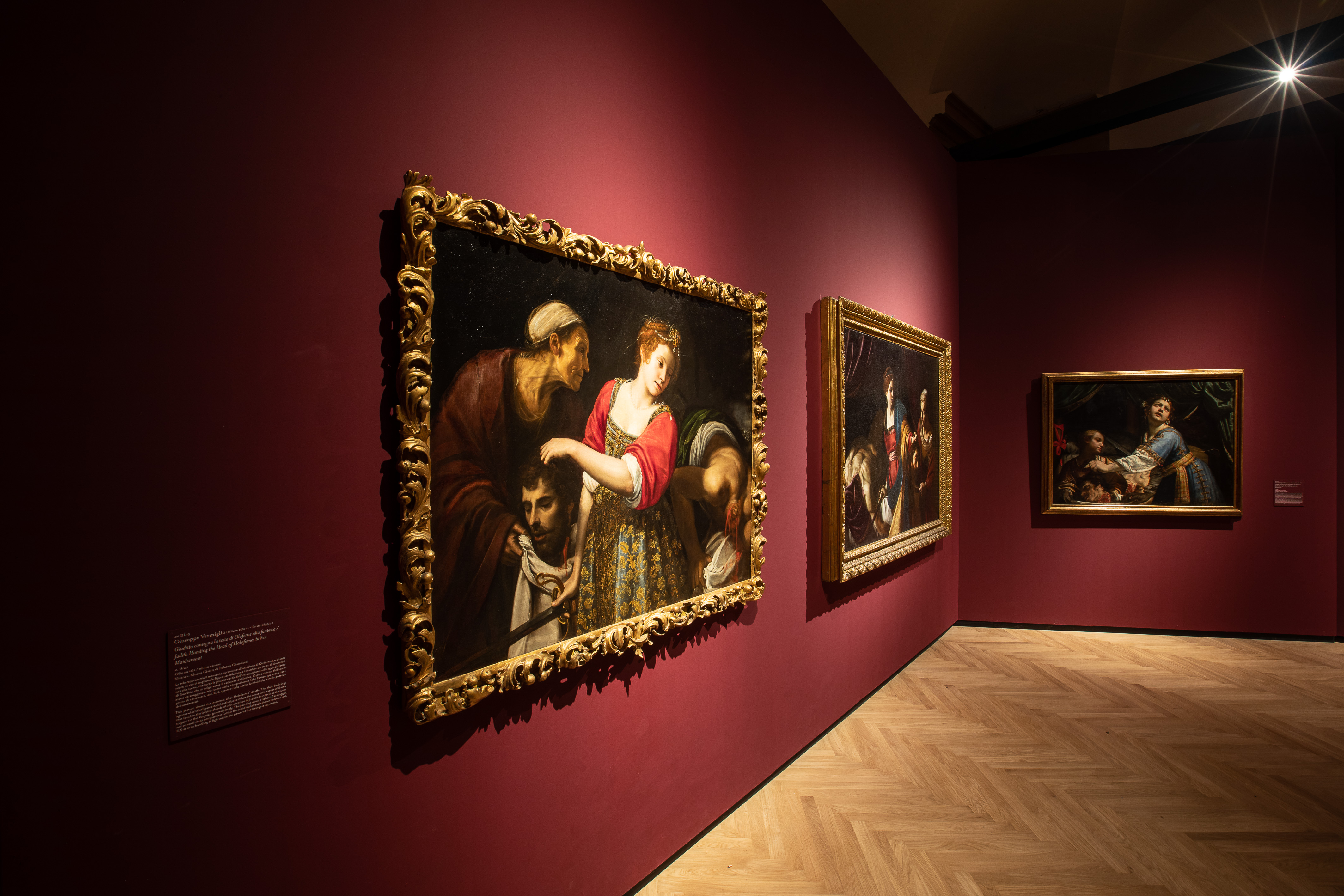 La tela Giuditta che decapita Oloferne del Merisi è il fulcro della seconda sezione dedicata a Caravaggio e i suoi primi interpreti e inscena un vero e proprio omicidio mediante decapitazione, costituendo un momento di rottura con la tradizione e trovando un corrispettivo solo nella coeva produzione di rappresentazioni sacre e drammi teatrali.