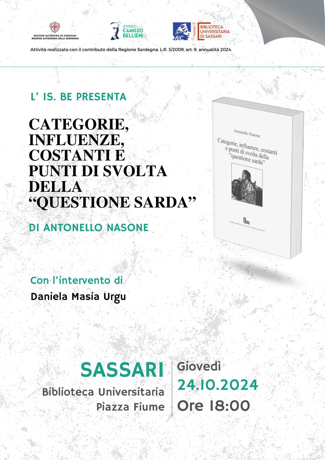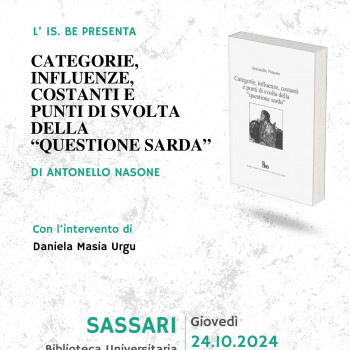 Presentazione del libro “Categorie, influenze costanti e punti di svolta della questione sarda” di Alessandro Nasone. La serata, dopo una breve introduzione del direttore, Giovanni Fiori, sarà condotta dall’autore Prof. Antonello Nasone, interverrà alla presentazione Daniela Masia Urgu.