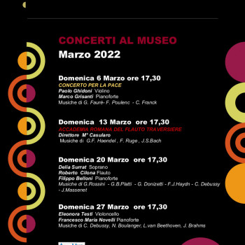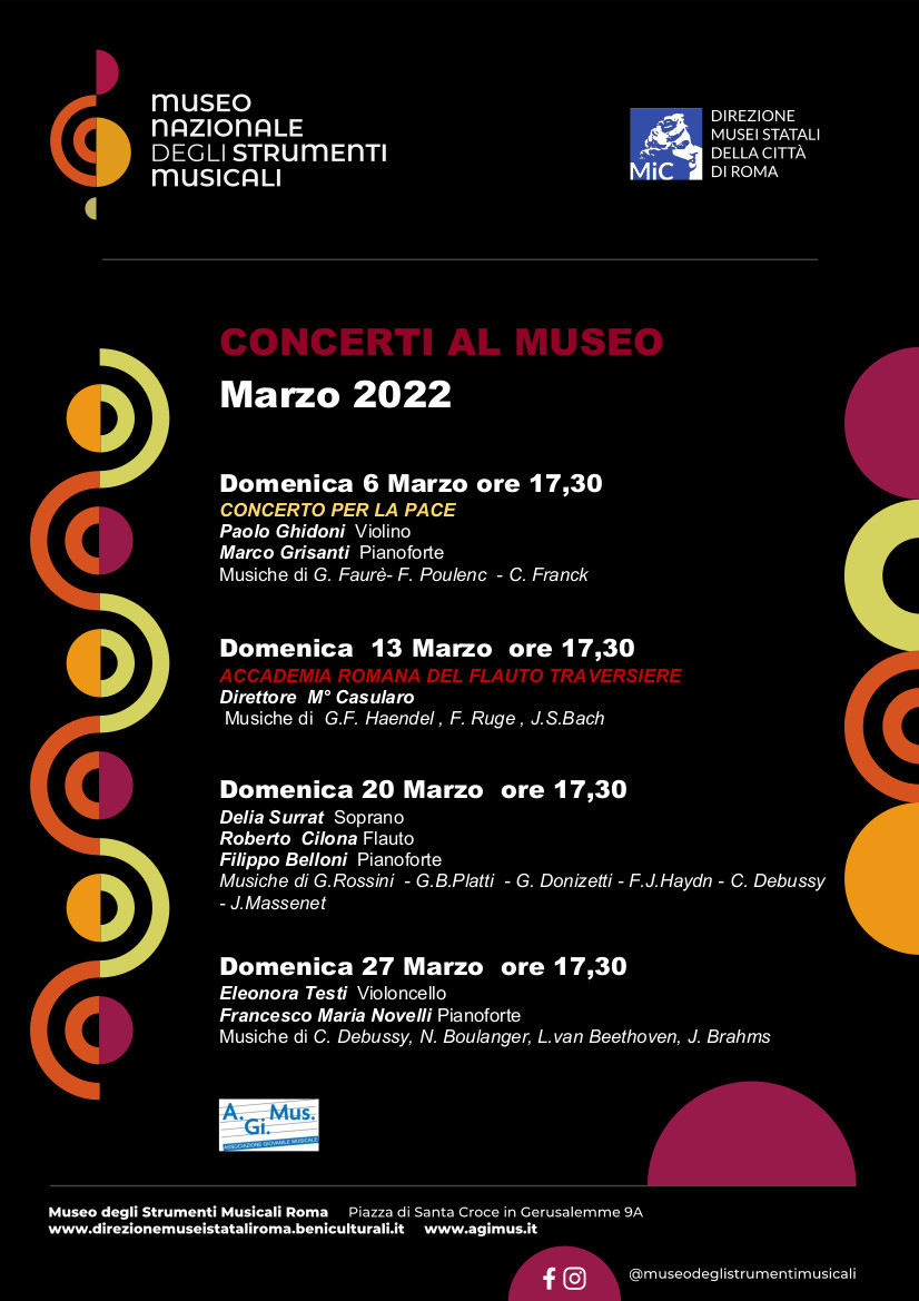 Il Museo Nazionale degli Strumenti Musicali riprende, nel mese di marzo, la programmazione dei concerti in collaborazione con l'Associazione Giovanile Musicale A.Gi. Mus per far sentire la voce della cultura in difesa della Pace.