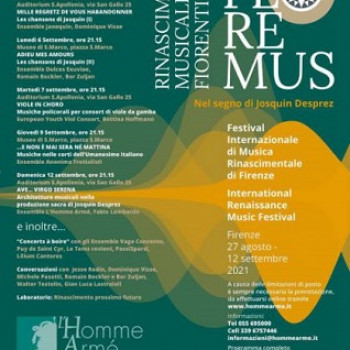 Prosegue lunedì 6 settembre nella Biblioteca monumentale di Michelozzo al Museo di San Marco la quinta edizione del festival internazionale di musica rinascimentale de L'Homme Armé «FloReMus. Rinascimento Musicale a Firenze». Il programma incentrato sull’importante ricorrenza dei 500 anni dalla morte di Josquin Desprez, Il Michelangelo della musica, si articolerà fino al 12 settembre come sempre in Concerti serali con gruppi di rilievo internazionale, Concerts à boire con gruppi emergenti, Conversazioni con studiosi e musicisti affermati e un Laboratorio dedicato naturalmente al Rinascimento.