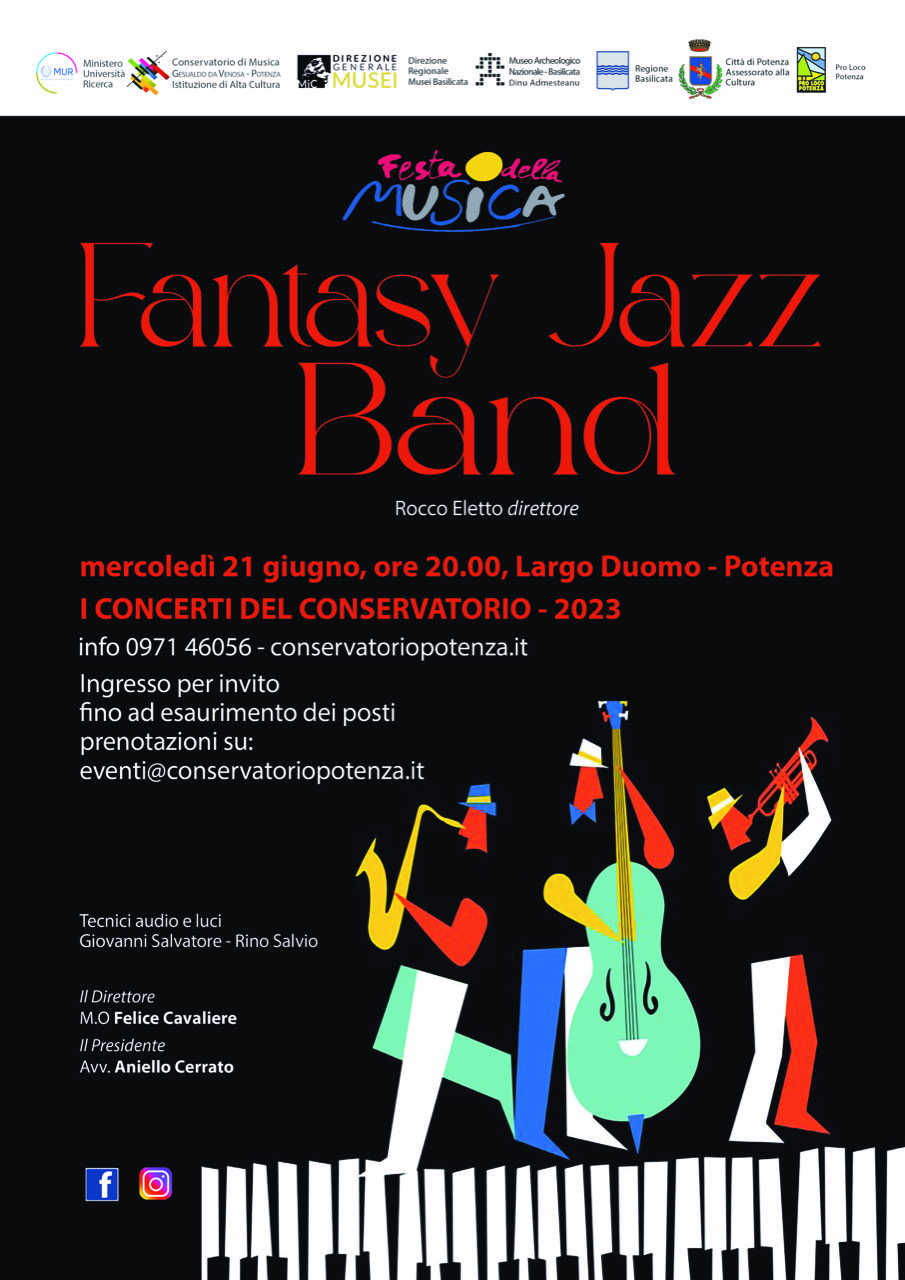 Mercoledì 21 giugno, ore 20.00 in Piazza Duomo a Potenza, nuovo appuntamento con il festival di musica classica, jazz e contemporanea a cura del conservatorio Carlo Gesualdo da Venosa di Potenza in collaborazione con DRM Basilicata-Museo Archeologico Nazionale della Basilicata "Dinu Adamesteanu". Il concerto spazierà dalle fantasie ritmiche dei brani jazz e latino-americani agli iconici brani della storia della musica rock. Ingresso per invito fino ad esaurimento posti. Prenotazioni su eventi@conservatoriopotenza.it.