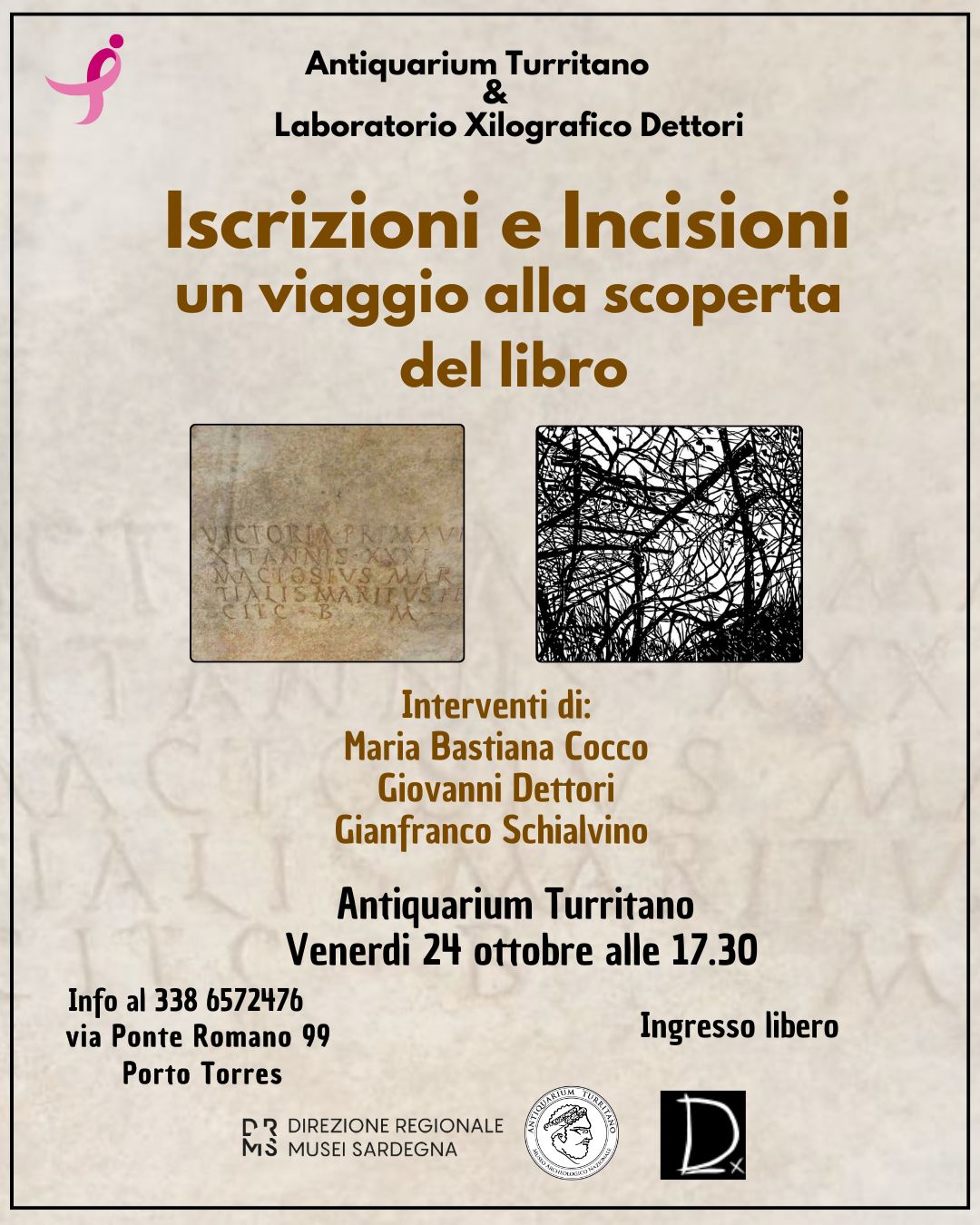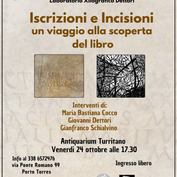 Maria Bastiana Cocco, assessore alla cultura del comune di Porto Torres ed archeologa, Giovanni Dettori, maestro incisore turritano e lo xilografo e storico dell'arte Gianfranco Schialvino ci parleranno delle epigrafi romane, la creazione della carta, le tecniche di stampa dei libri.