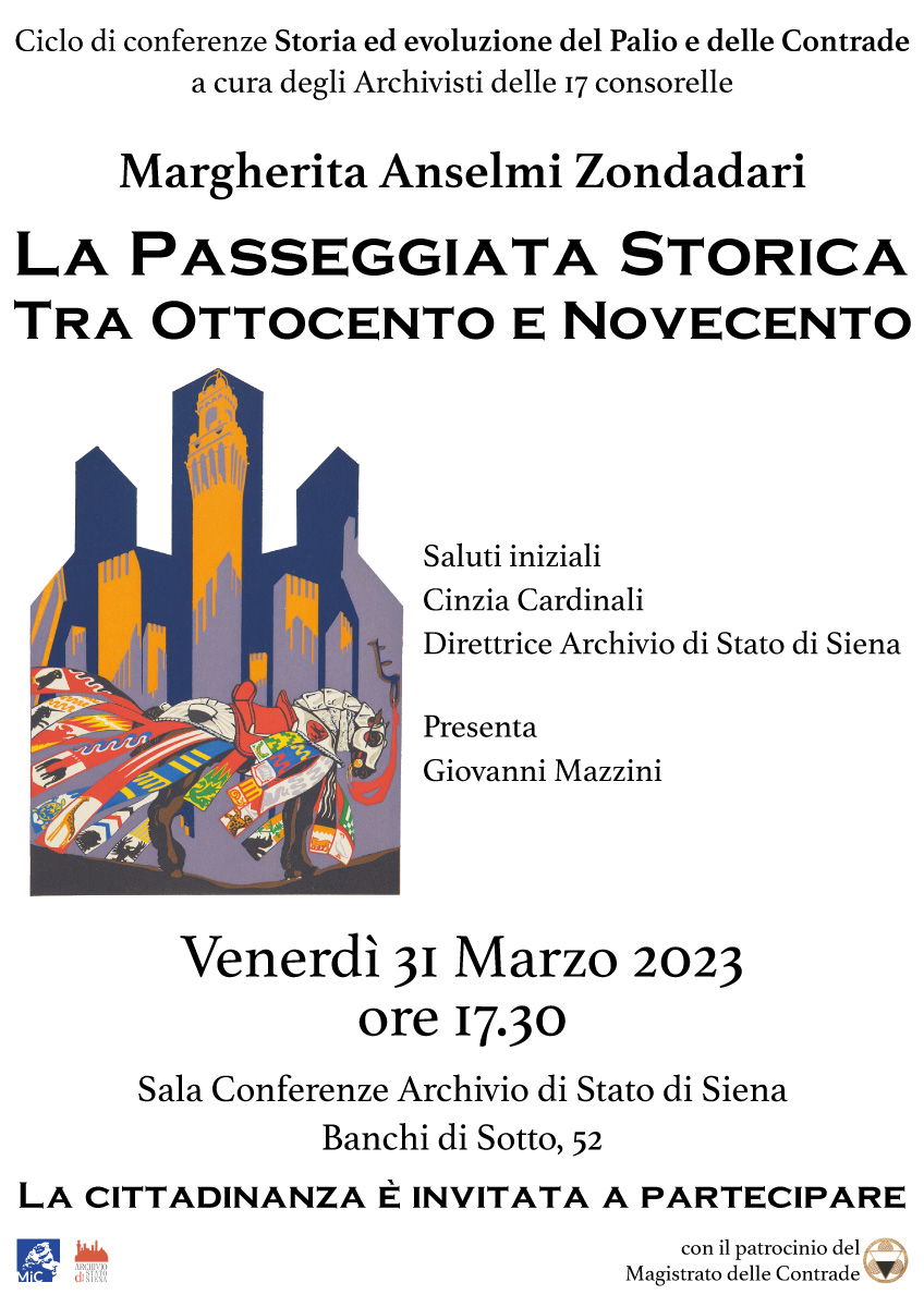 A Siena, venerdì 31 marzo 2023, alle ore 17,30, presso la sede dell’Archivio di Stato (via Banchi di Sotto, 52), si tiene la conferenza di Margherita Anselmi Zondadari dal titolo: “La Passeggiata Storica tra Ottocento e Novecento” che si svolge nell’ambito del Ciclo di conferenze sulla Storia ed evoluzione del Palio e delle Contrade a cura degli Archivisti delle 17 consorelle e con il patrocinio del Magistrato delle Contrade.