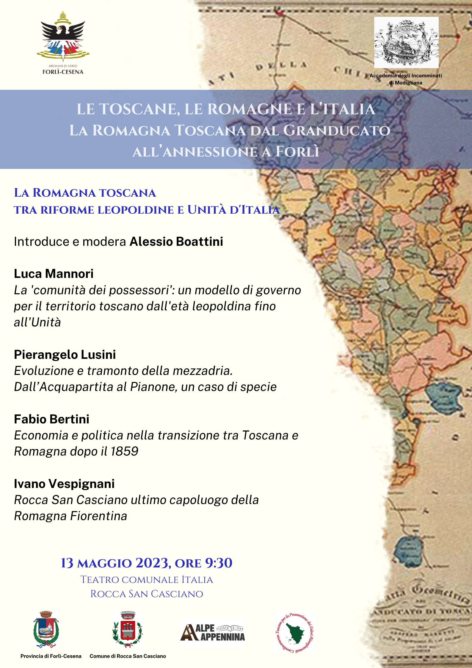 In occasione del centenario del passaggio di dodici dei quindici comuni che formano la Romagna Toscana dalla Provincia di Firenze alla Provincia di Forlì, con il regio decreto n. 544 del 4 marzo 1923, il nostro Istituto, in collaborazione con il Comitato della Romagna Toscana per la promozione dei valori risorgimentali, con il contributo dell’Accademia degli Incamminati di Modigliana e il patrocinio della Provincia di Forlì-Cesena e dei quindici comuni della Romagna Toscana, realizzerà per il 2023 una serie di iniziative che vogliono essere un momento di riflessione sulla lunga e ricca storia di questo territorio in ambito socio-economico, politico, istituzionale e di identità culturale.