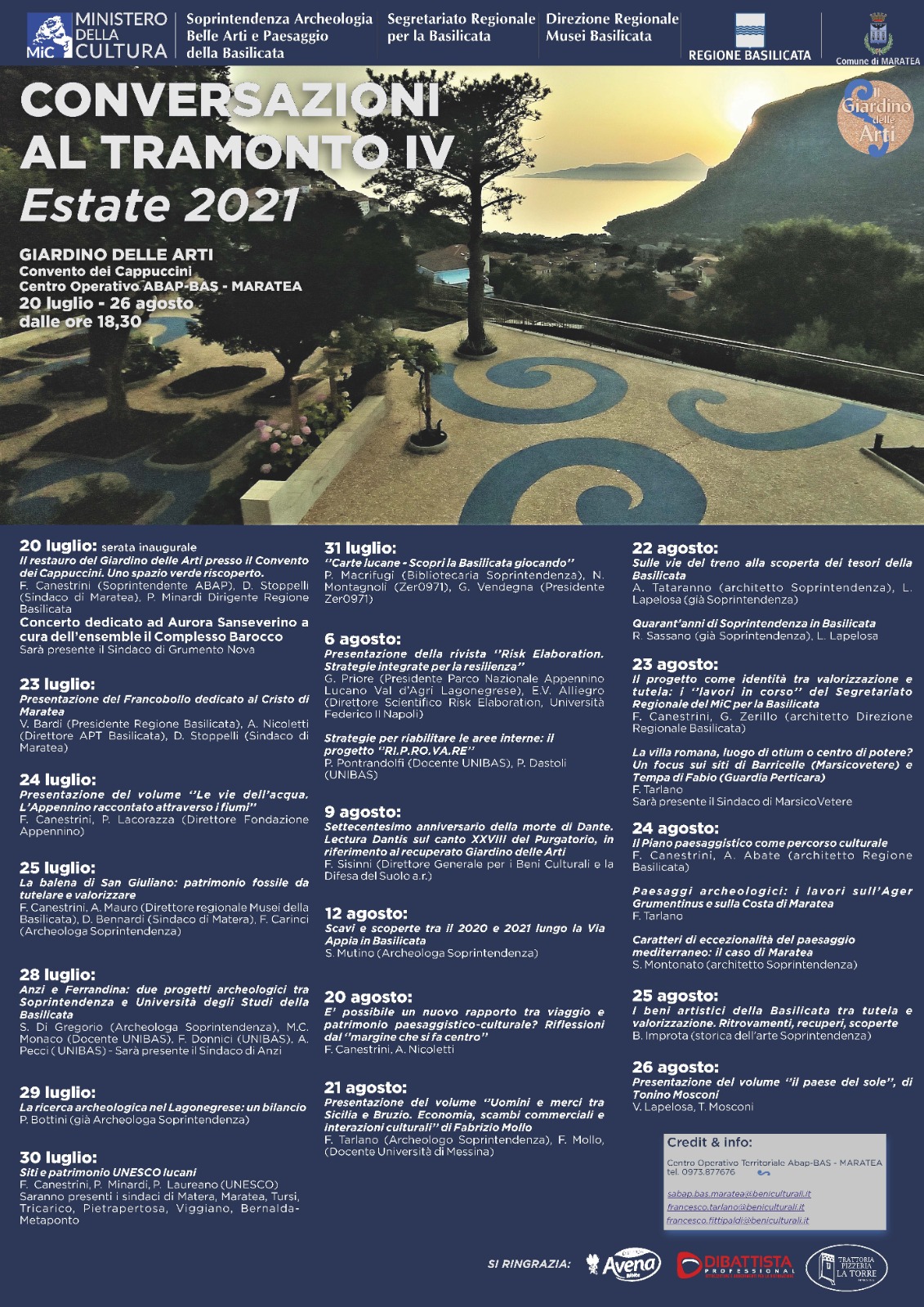 Quest’estate a Maratea si rinnova l’appuntamento con la Cultura lucana: la Soprintendenza Archeologia Belle Arti e Paesaggio della Basilicata ha organizzato la quarta edizione del ciclo di incontri Conversazioni al tramonto, in collaborazione con il Segretariato Regionale del Ministero della Cultura per la Basilicata, la Direzione Regionale Musei della Basilicata e la Città di Maratea. Nel Convento dei Cappuccini, sede del centro operativo della Soprintendenza della cittadina tirrenica, il giorno 20 luglio alle ore 18,30 il Soprintendente arch. Francesco Canestrini, la dott.ssa Patrizia Minardi (Regione Basilicata) e il Sindaco di Maratea avv. Daniele Stoppelli inaugureranno il restauro del Giardino delle Arti, antico spazio verde da adibire a eventi culturali, caratterizzato dalla suggestiva vista sul golfo. La serata sarà allietata dal Concerto dedicato ad Aurora Sanseverino, poetessa dell’Arcadia originaria di Grumento, a cura dell’ensemble il Complesso Barocco. A partire dal 23 luglio, alle 18,30, il Giardino delle Arti ospiterà un ricco parterre di relatori: archeologi, architetti, storici dell’arte, studiosi, antropologi, docenti universitari, figure delle istituzioni si confronteranno con serate a tema, presentando lavori, progetti, ricerche, libri. Il fil rouge sarà sempre la Basilicata, e in particolar modo il patrimonio culturale lucano, da tutelare, valorizzare e promuovere. “Conversazioni al tramonto”, spiega il soprintendente Francesco Canestrini, “non solo arricchisce l’estate culturale di Maratea tenendo fede alla sua vivacità culturale e turistica, ma vuole offrire ai cittadini e ai viaggiatori un’occasione per volgere lo sguardo altrove: al pensiero, alla socialità e alla cultura. Quest’anno il ricco calendario vuole dare maggiore risalto a Maratea e alla Basilicata tutta, con l’inaugurazione di un nuovo luogo della cultura, il Giardino delle Arti”. Gli altri incontri in calendario si terranno, tutti alle 18,30 nella splendida cornice del Giardino delle Arti del Convento dei Cappuccini, da cui si potrà ammirare l’affascinante tramonto marateota. Le date degli eventi, così come descritte nella locandina allegata, saranno: 20, 23, 24, 25, 28, 29,30 e 31 luglio; 6, 9, 12, 20, 21, 22, 23, 24, 25 e 26 agosto. L'accesso sarà garantito ad un numero limitato di persone, previo utilizzo di mascherine e distanziamento sociale, nel rispetto delle disposizioni per la prevenzione del contagio da Covid-19.