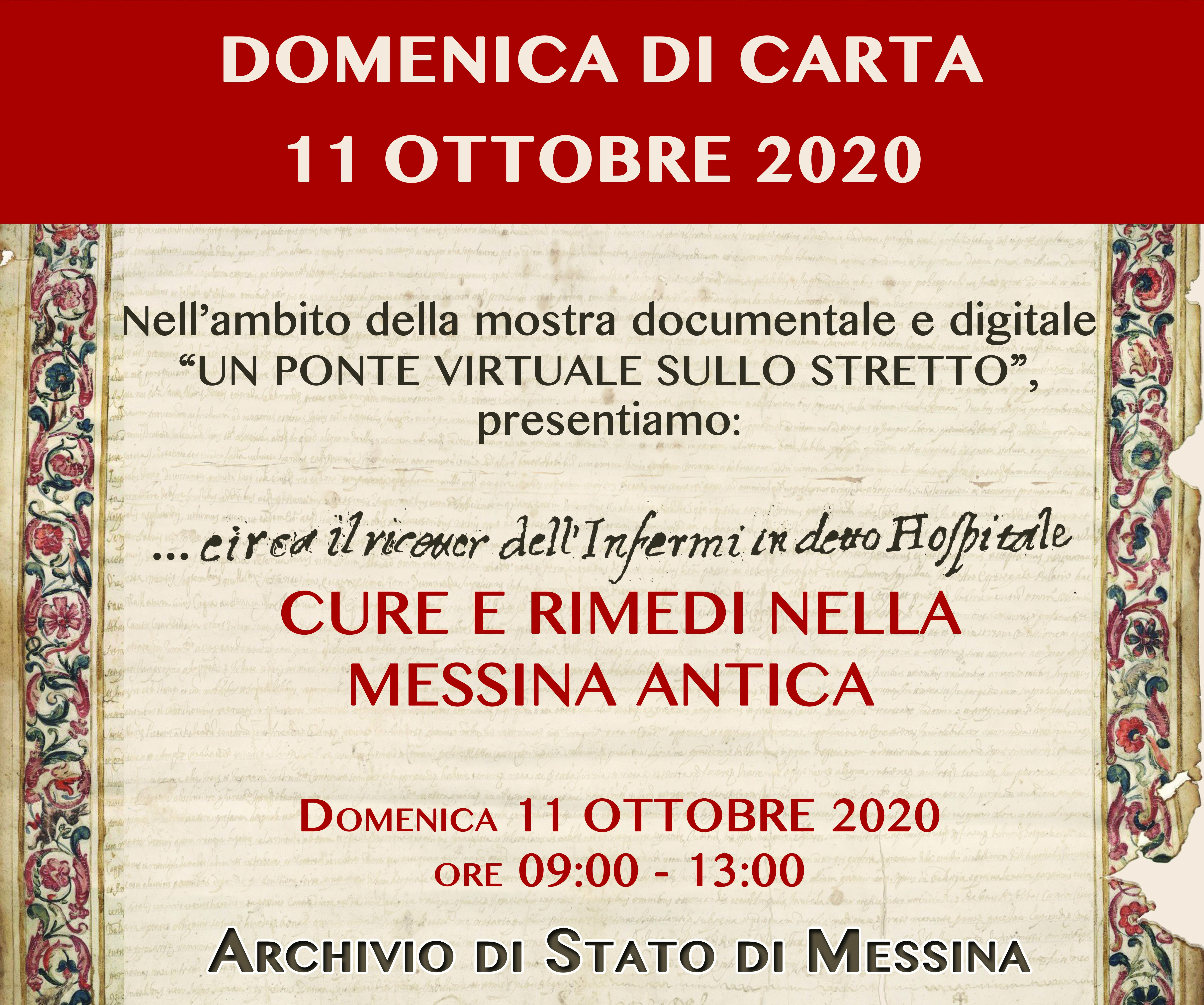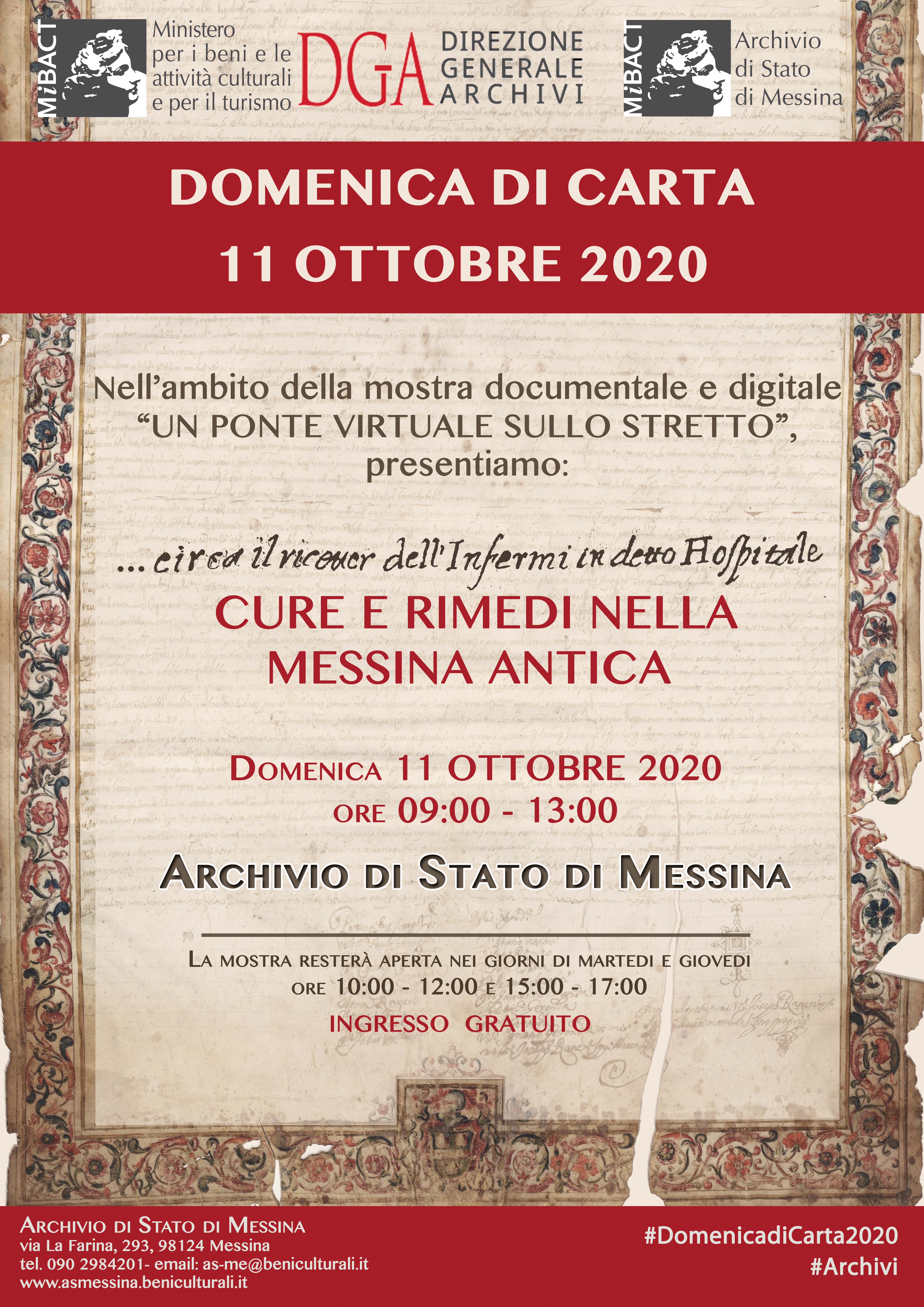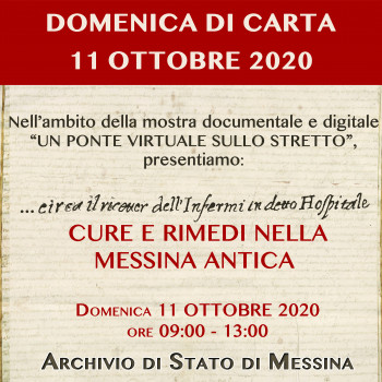 In occasione della Domenica di Carta 2020, alla luce della particolare situazione che vive l’umanità odierna, si propone attraverso una mostra storico – documentale il racconto degli avvenimenti nella città di Messina relativamente alle epidemie e alle emergenze sanitarie nonché delle soluzioni mediche e sociali adottate dalla città. Attraverso i fondi dell’Ospedale S. Maria la Pietà, Donazione Bongiovanni, Fondo Pergamenaceo ed altri, si narra la storia degli ospedali e della medicina messinese.