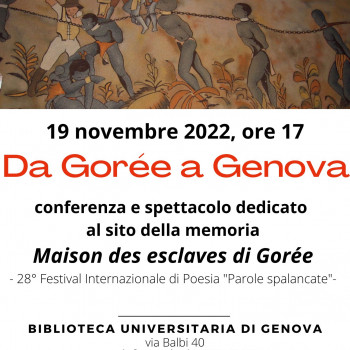 L'evento "Da Gorée a Genova" si inscrive nella programmazione del 28° Festival Internazionale di Poesia "Parole spalancate" e avrà luogo negli spazi della Biblioteca Universitaria di Genova (Via Balbi 40) a partire dalle ore 17.