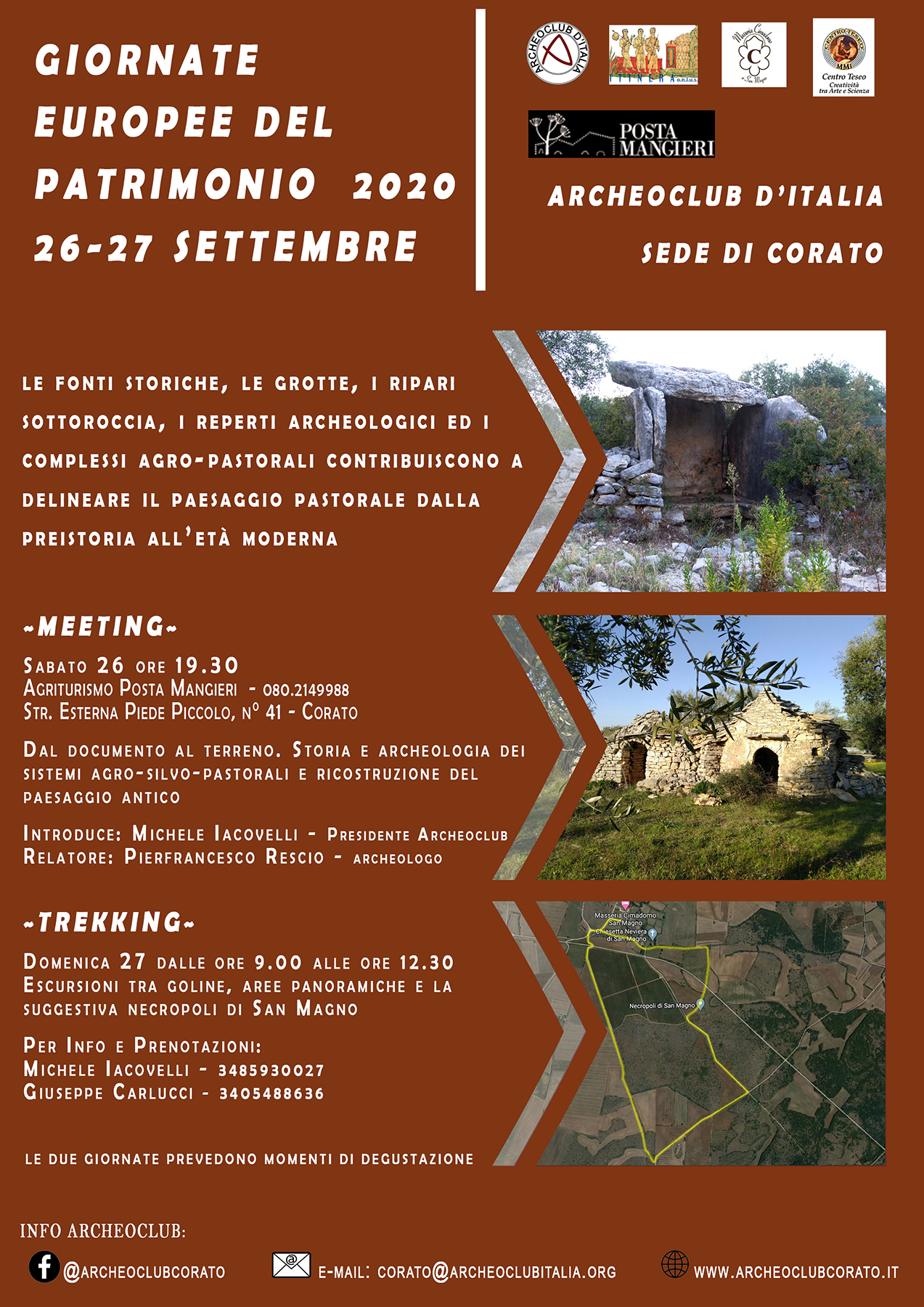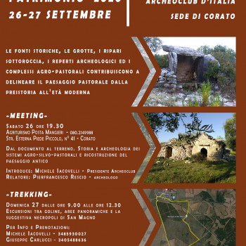Uno dei principali interessi su cui il convegno si focalizza è lo studio del territorio, dall’Abruzzo al Molise e dalla Campania e Basilicata in direzione della Puglia, luogo della Dogana delle pecore, l’attività transumante che va dalla preistoria sino dal XX secolo. Partendo dal territorio di Corato e dai resti materiali di recinzioni, trulli e viabilità, documenteremo un quadro globale del Passato e le ragioni della sua evoluzione o del suo degrado (historical ecology), attraverso una serie di analisi “concrete” di manufatti, chiese, luoghi e punti notevoli, unità fotografiche e topografiche, unici testimoni dei mutamenti o della permanenza di certe forme insediative. Quanto rappresentato nel corso del meeting si concretizzerà, il giorno dopo, con l'escursione per il territorio di Corato (tratturi Barletta-Grumo e Corato-Fontanadogna) attraversando boschi residuali, necropoli protostoriche, boschi medievali, fortezze tardoantiche, pozzi e cisterne.
