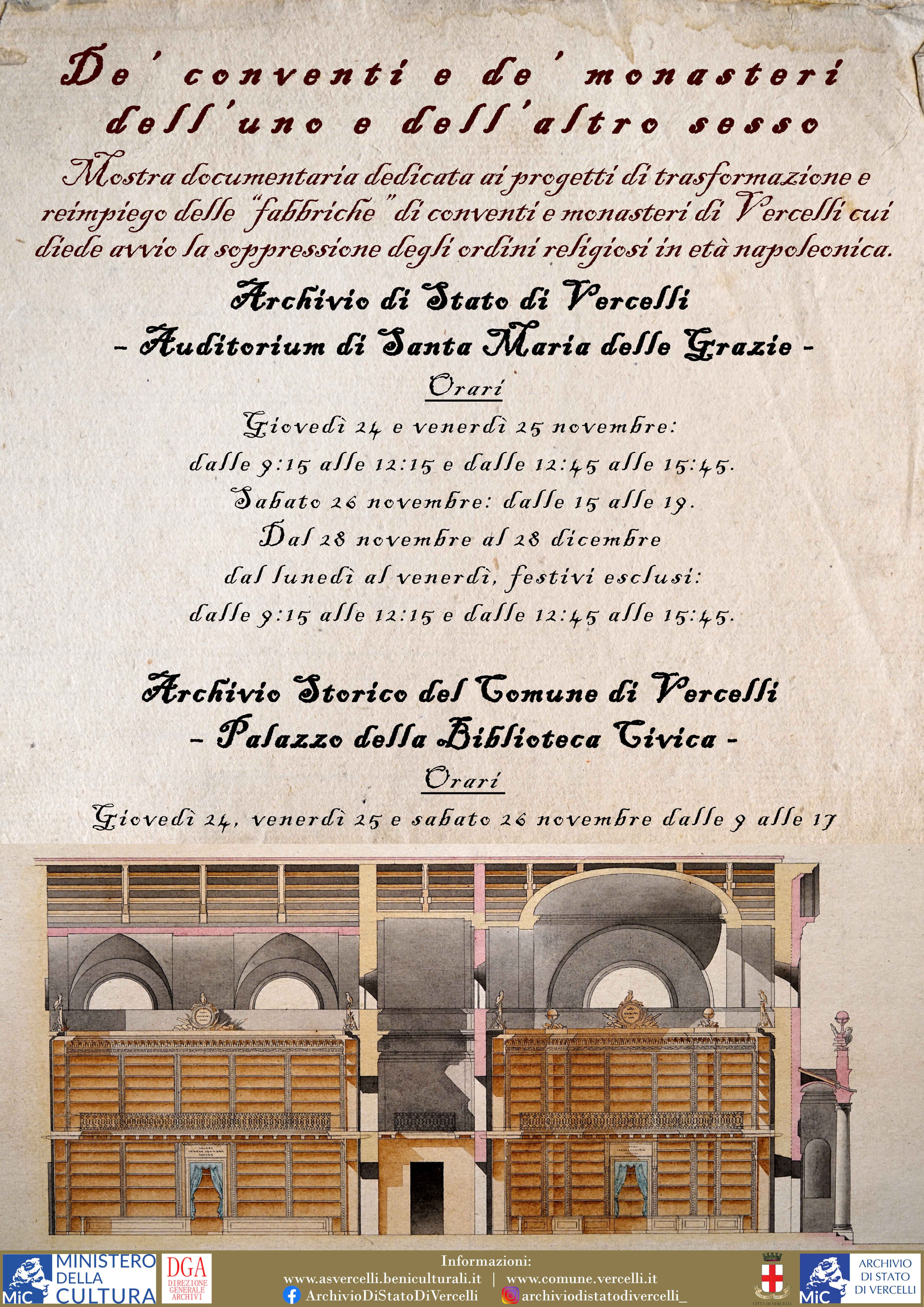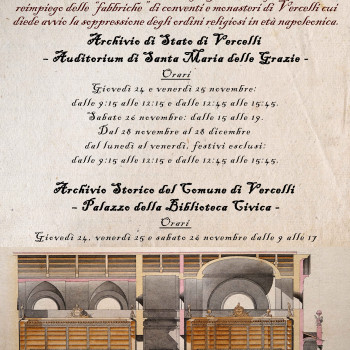 L’Archivio di Stato di Vercelli è lieto di presentare la mostra documentaria De’ conventi e de’ monasteri dell’uno e dell’altro sesso, dedicata ai progetti di trasformazione e reimpiego delle “fabbriche” di conventi e monasteri di Vercelli cui diede avvio la soppressione degli ordini religiosi in età napoleonica.