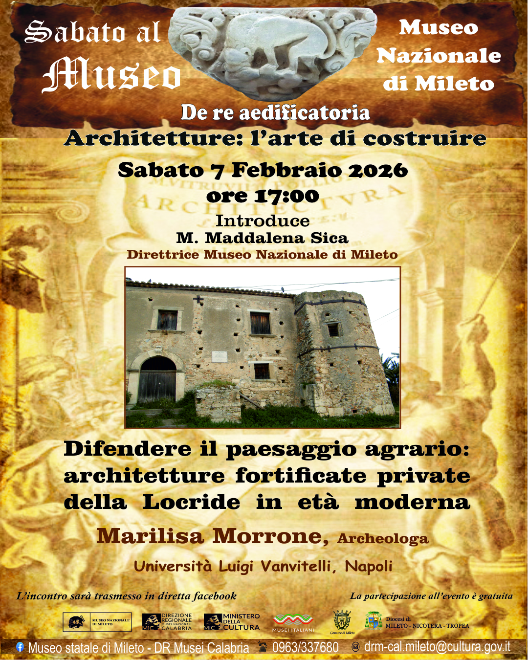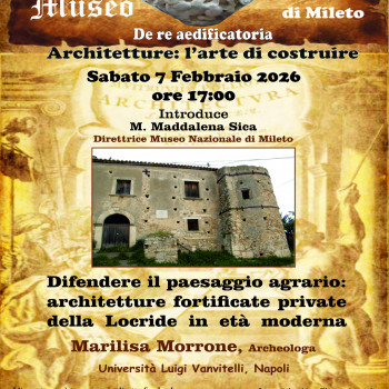Ormai a metà percorso, ogni appuntamento si conferma una preziosa fonte di arricchimento storico, architettonico e culturale. Sabato 7 febbraio Marilisa Morrone, archeologa Università Luigi Vanvitelli di Napoli guiderà il pubblico sul tema "Difendere il paesaggio agrario: architetture fortificate private della Locride in età moderna”