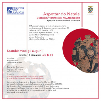 Domenica 5 dicembre la direzione del Museo e Parco archeologico nazionale di Locri presenta l’iniziativa "Aspettando Natale", che prevede un fitto calendario di aperture straordinarie del Museo di Palazzo Nieddu del Rio.