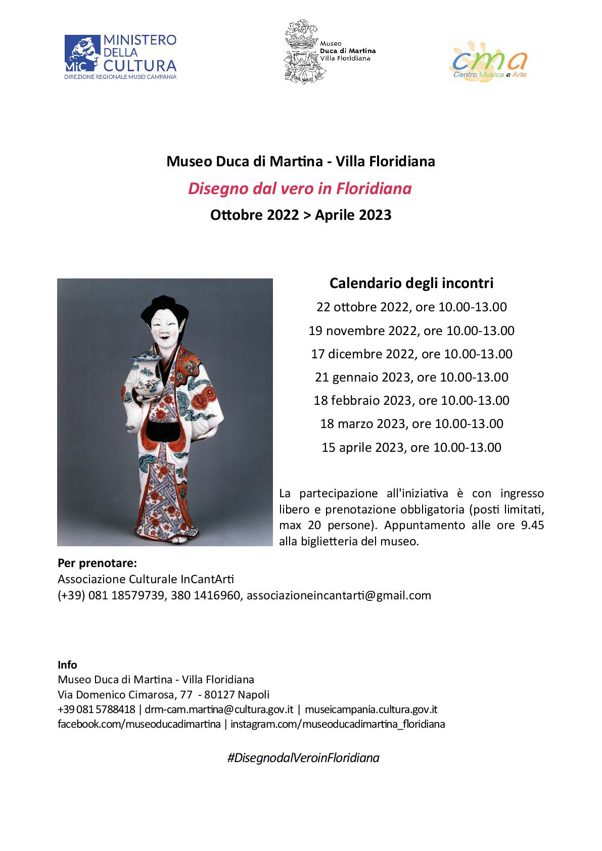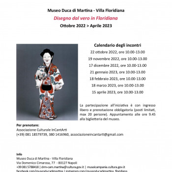 Sabato 22 ottobre 2022 alle ore 10.00 al Museo Duca di Martina nella Villa Floridiana, riprenderà per il terzo anno il ciclo di lezioni di “Disegno dal Vero in Floridiana”, organizzato dalla Direzione regionale Musei Campania in collaborazione con l’Associazione culturale InCantArti - Centro Musica e Arte di Napoli.