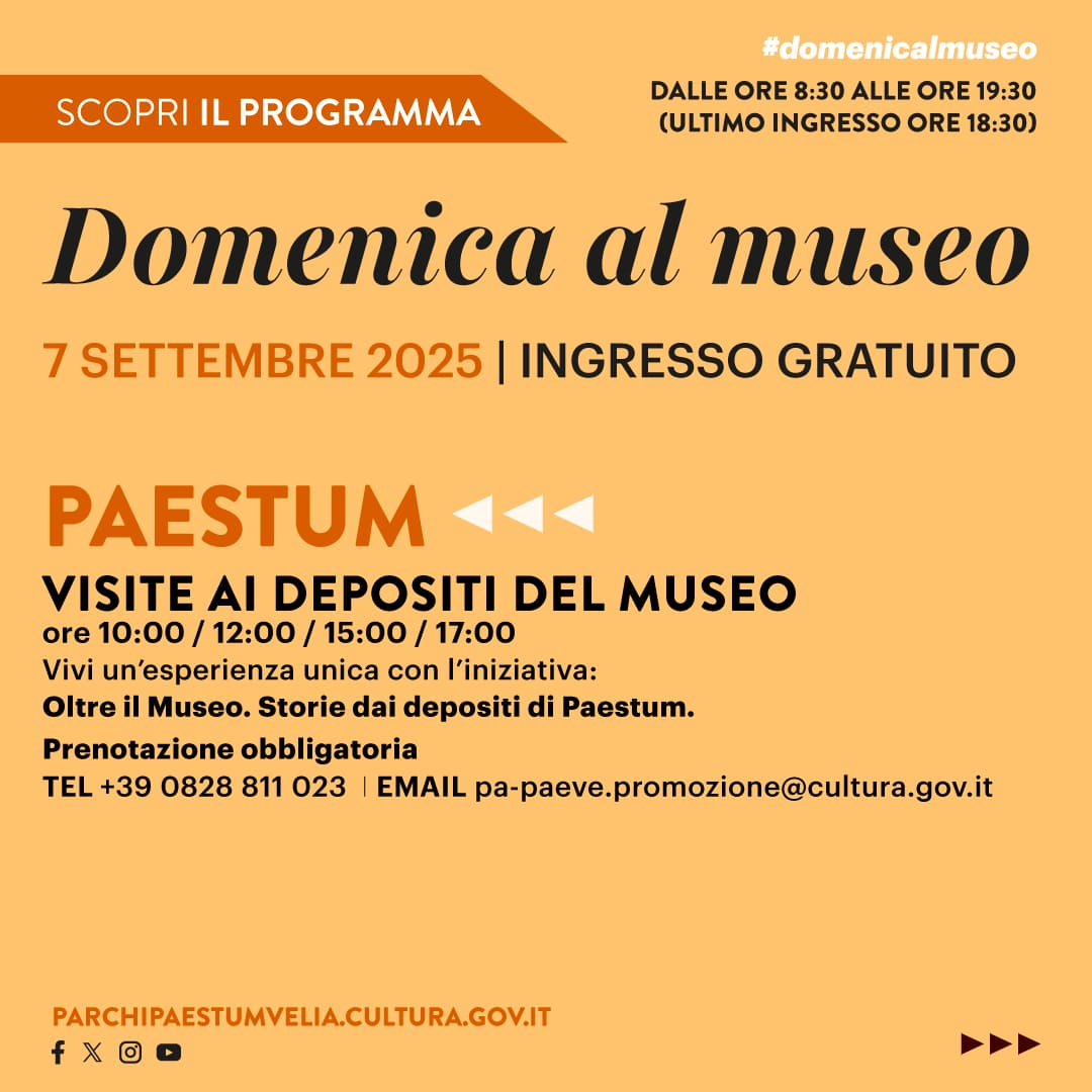 Visite ai depositi del Museo di Paestum: alle ore 10:00, 12:00, 15:00 e 17:00 apriranno le porte dei depositi museali, un’occasione rara per ammirare reperti poco noti e scoprire storie affascinanti legate alla città antica.
