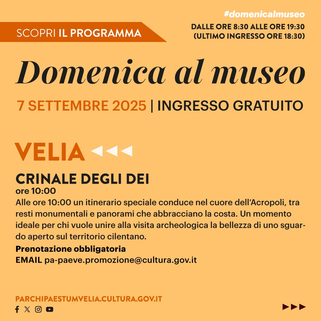 Passeggiata al Crinale degli Dei (Velia): alle ore 10:00 un itinerario suggestivo condurrà nel cuore dell’Acropoli, tra resti monumentali e panorami che abbracciano la costa cilentana. Un’occasione per unire la visita archeologica alla bellezza del paesaggio.