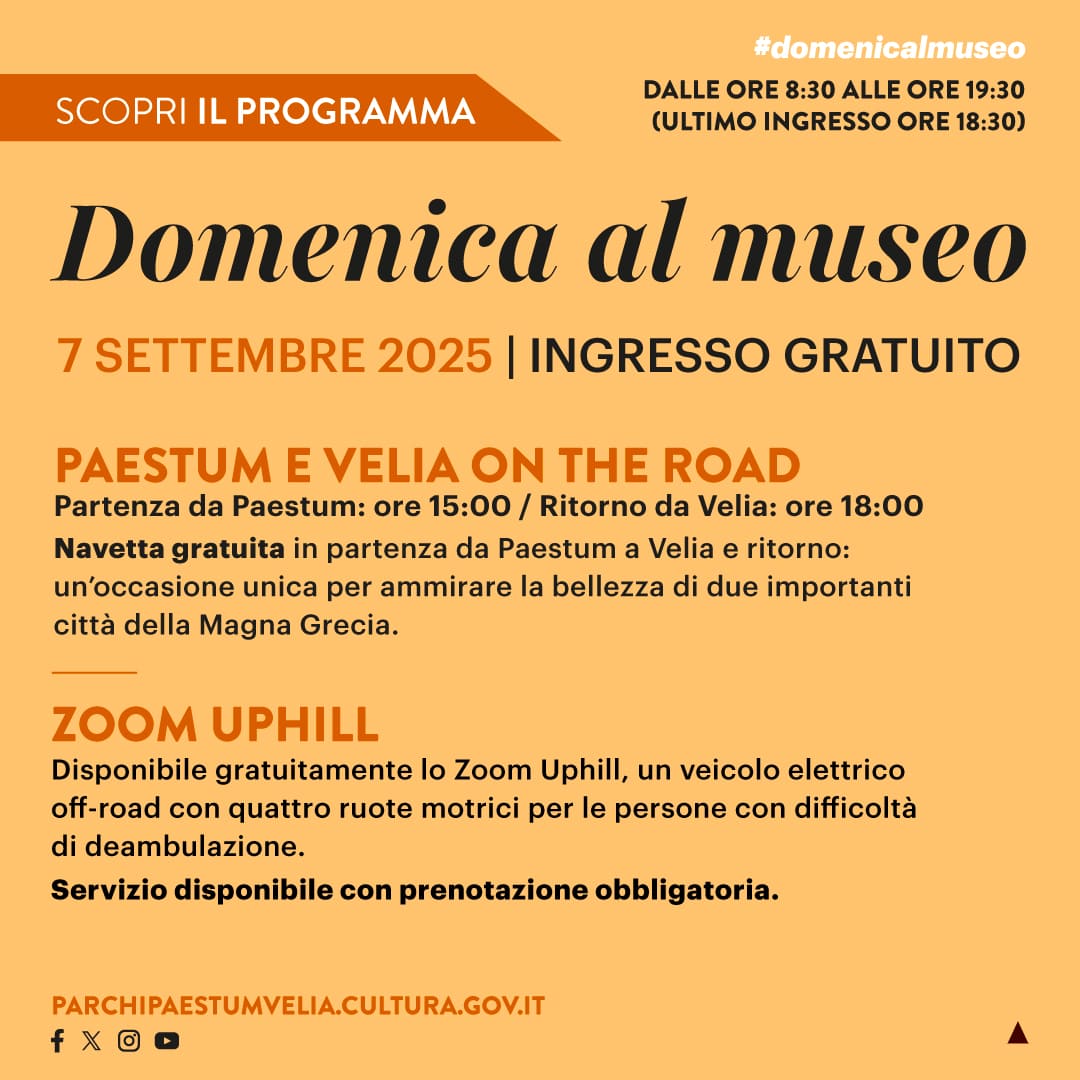 la navetta gratuita “Paestum e Velia on the road”, che collega i due siti durante la giornata con partenza da Paestum ‘parcheggio Voza’ alle ore 15:00 e rientro da Velia alle ore 18:00